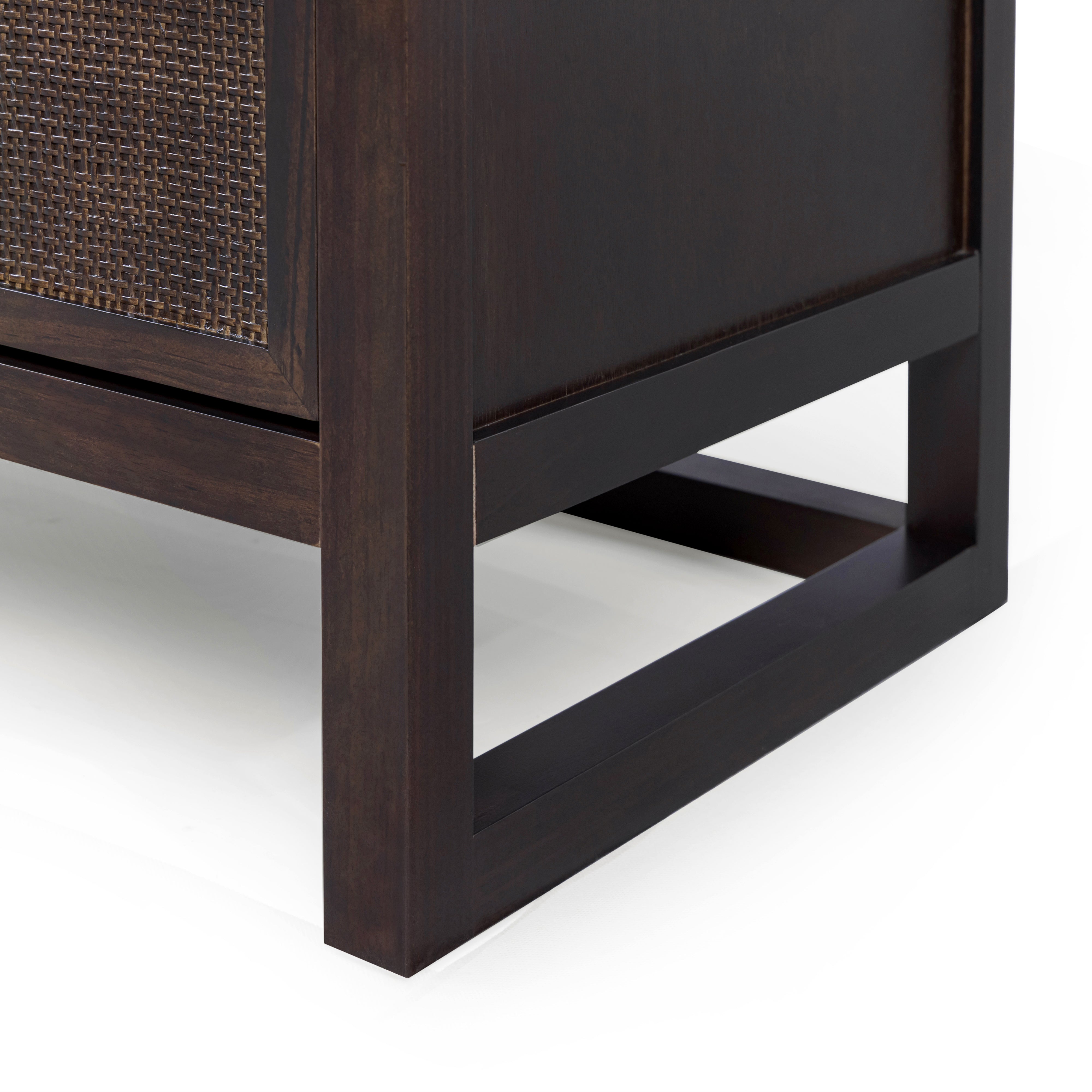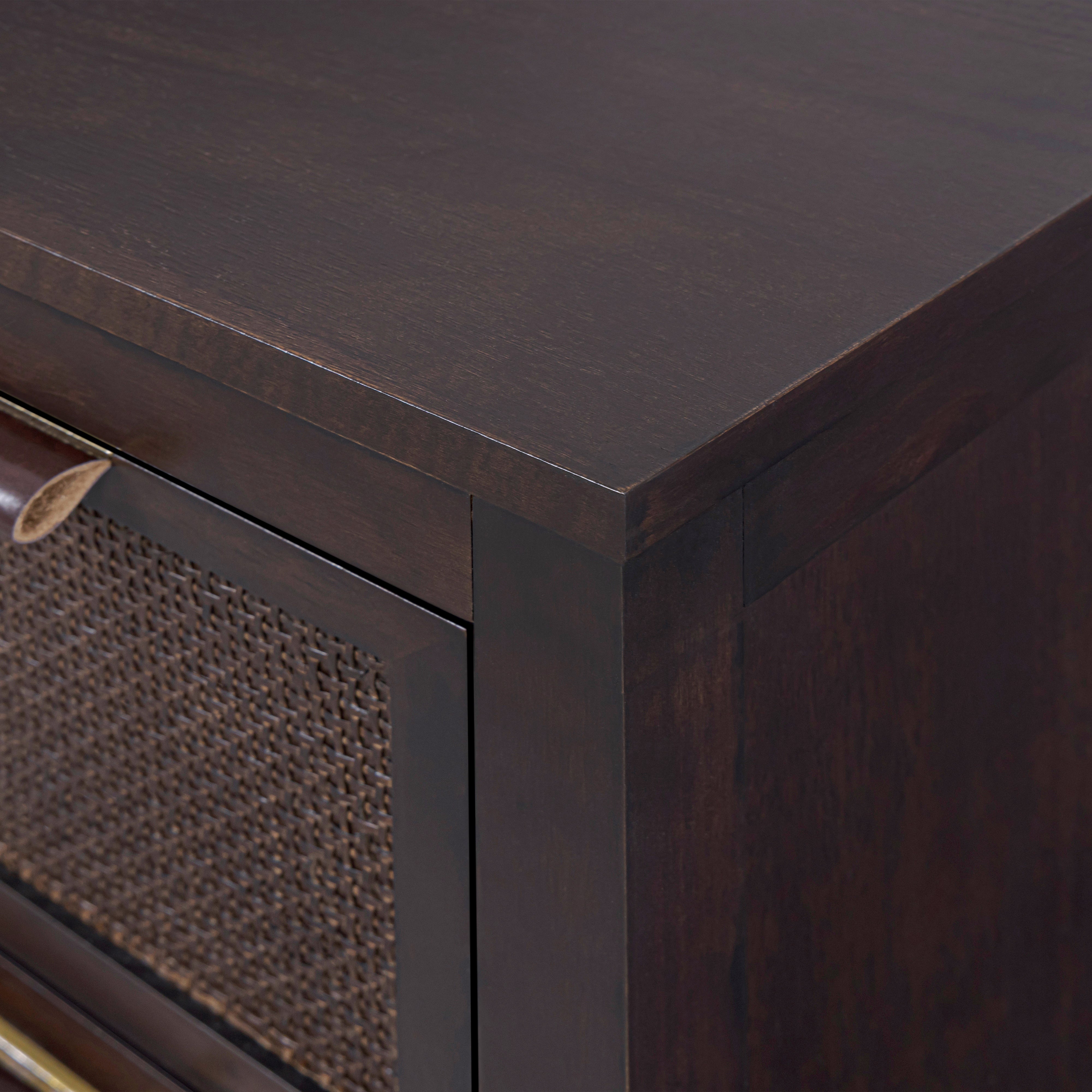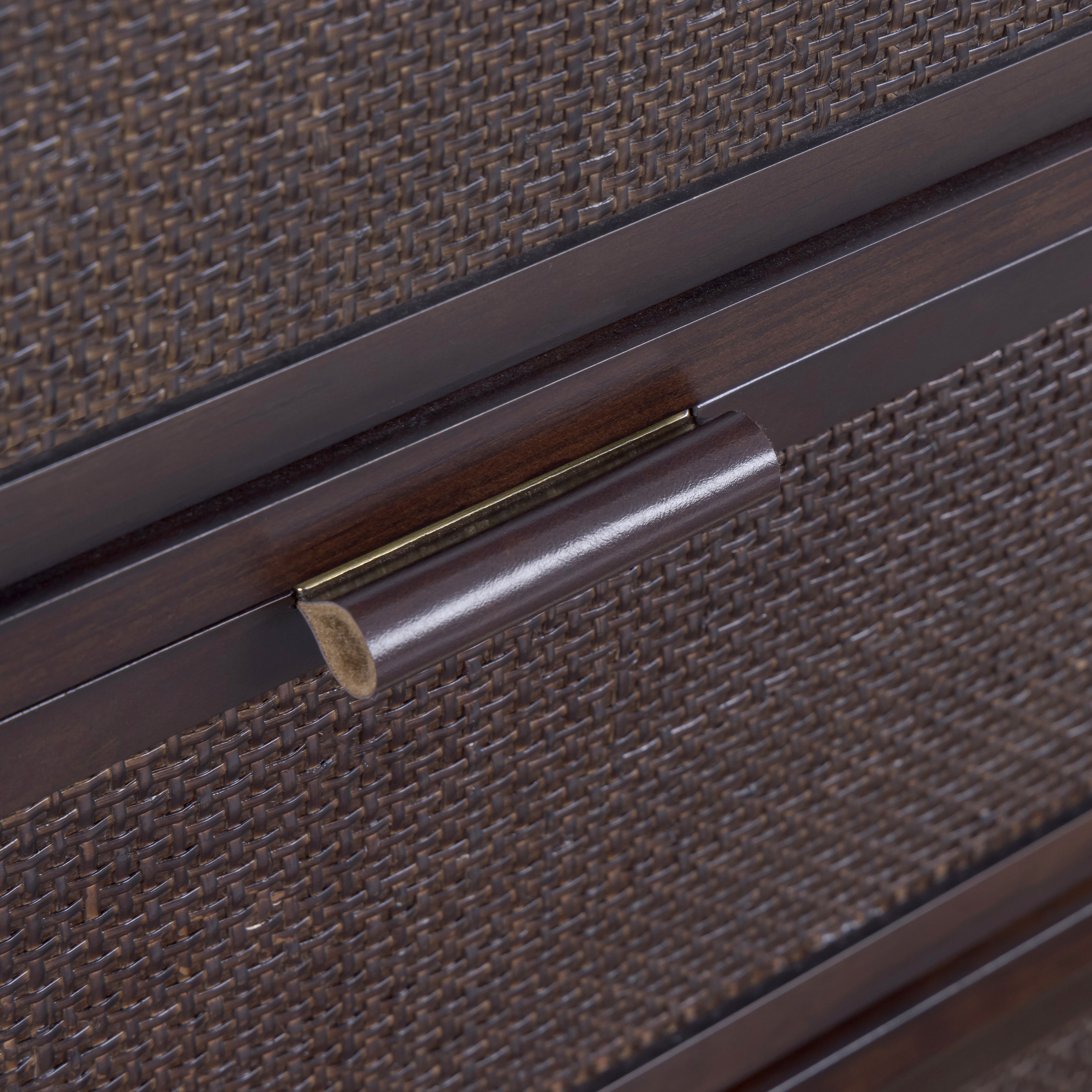 Textured Rattan Drawer Fronts: Rattan panels add depth and warmth, softening the modern silhouette with natural texture.