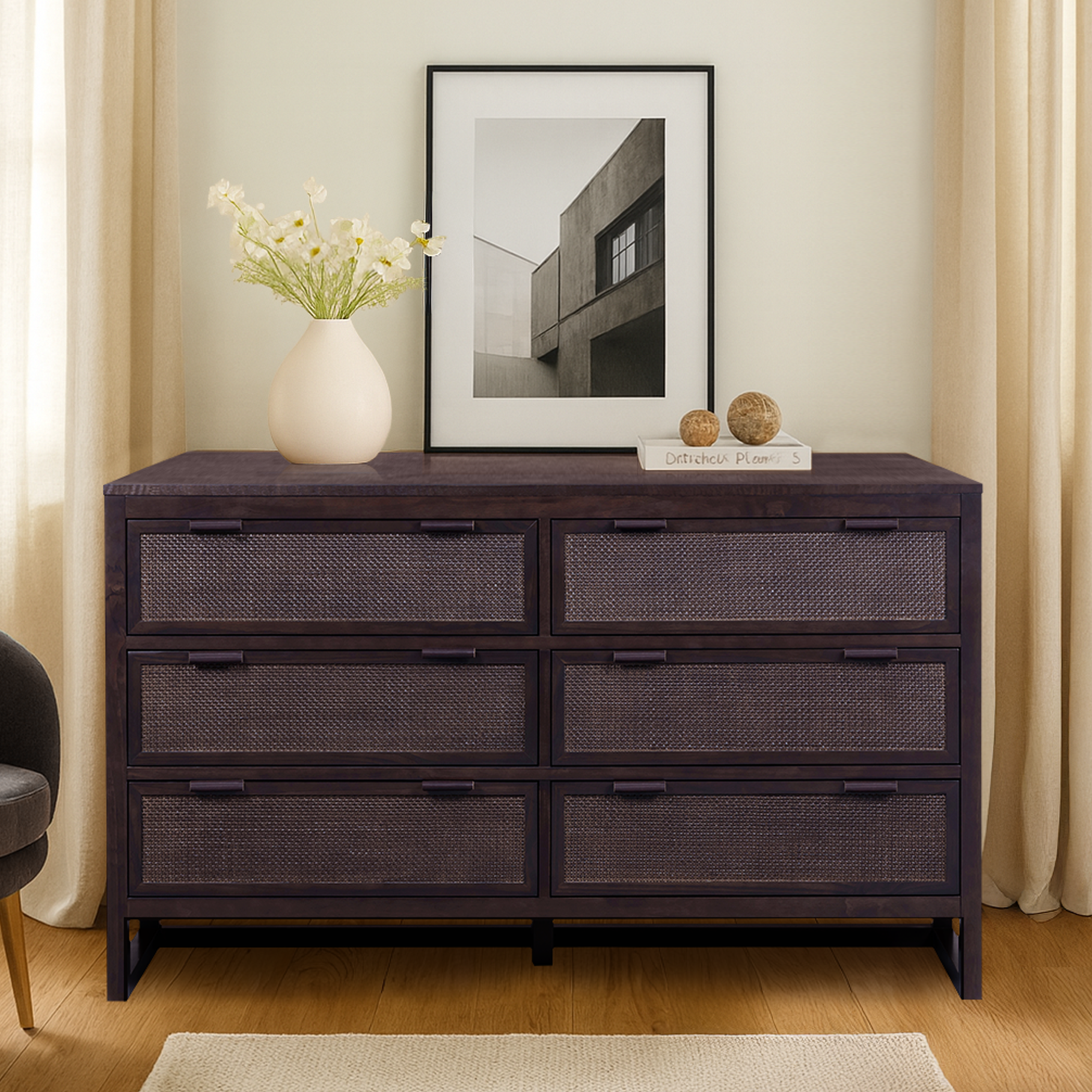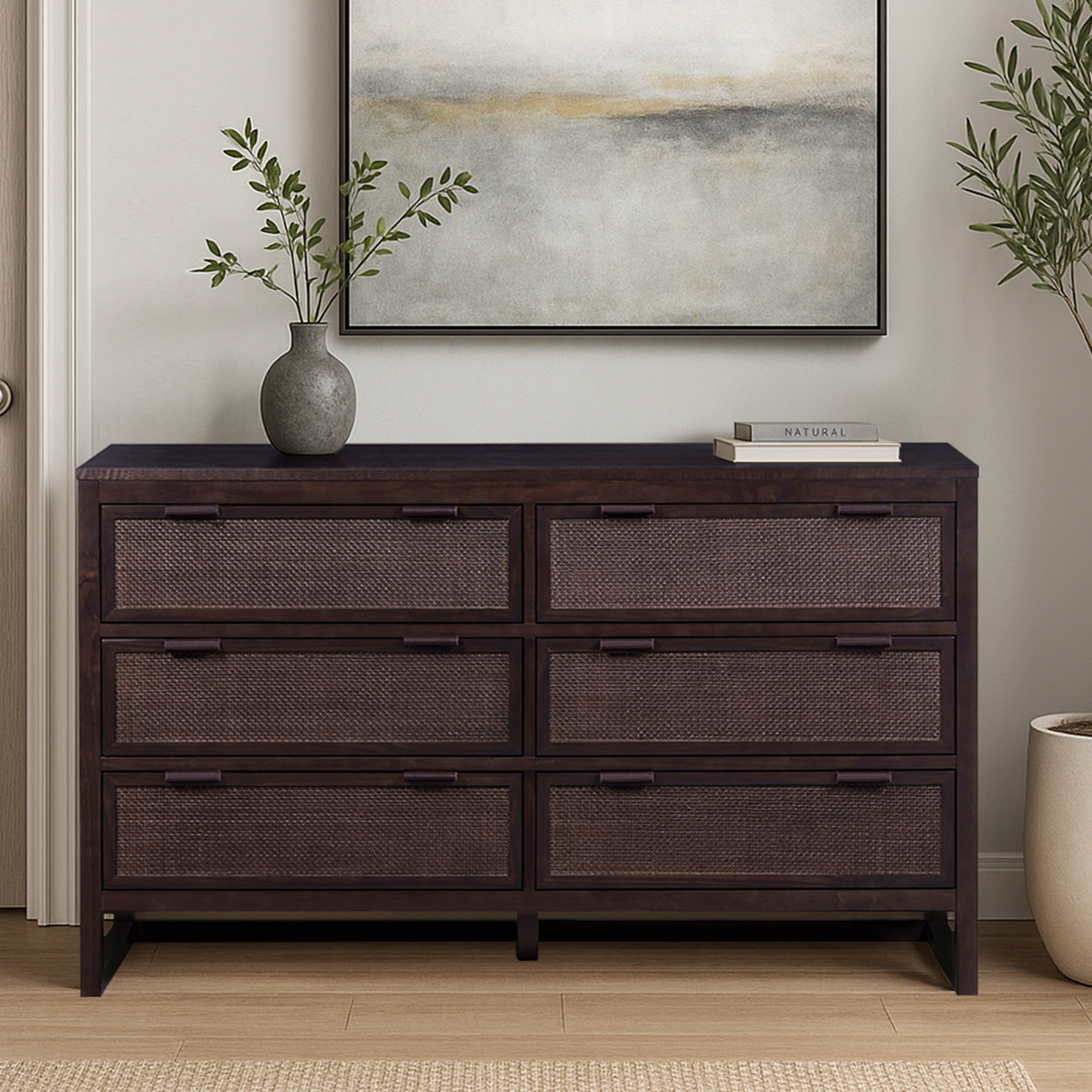 The rattan inset drawer fronts add texture and visual warmth, softening the modern lines and creating a distinctive focal point. Six deep drawers provide ample space for organising clothing and accessories, making it easy to keep bedrooms tidy without sacrificing style. Smooth drawer operation supports regular use, while the wide top surface offers room for lamps, mirrors or decorative items.