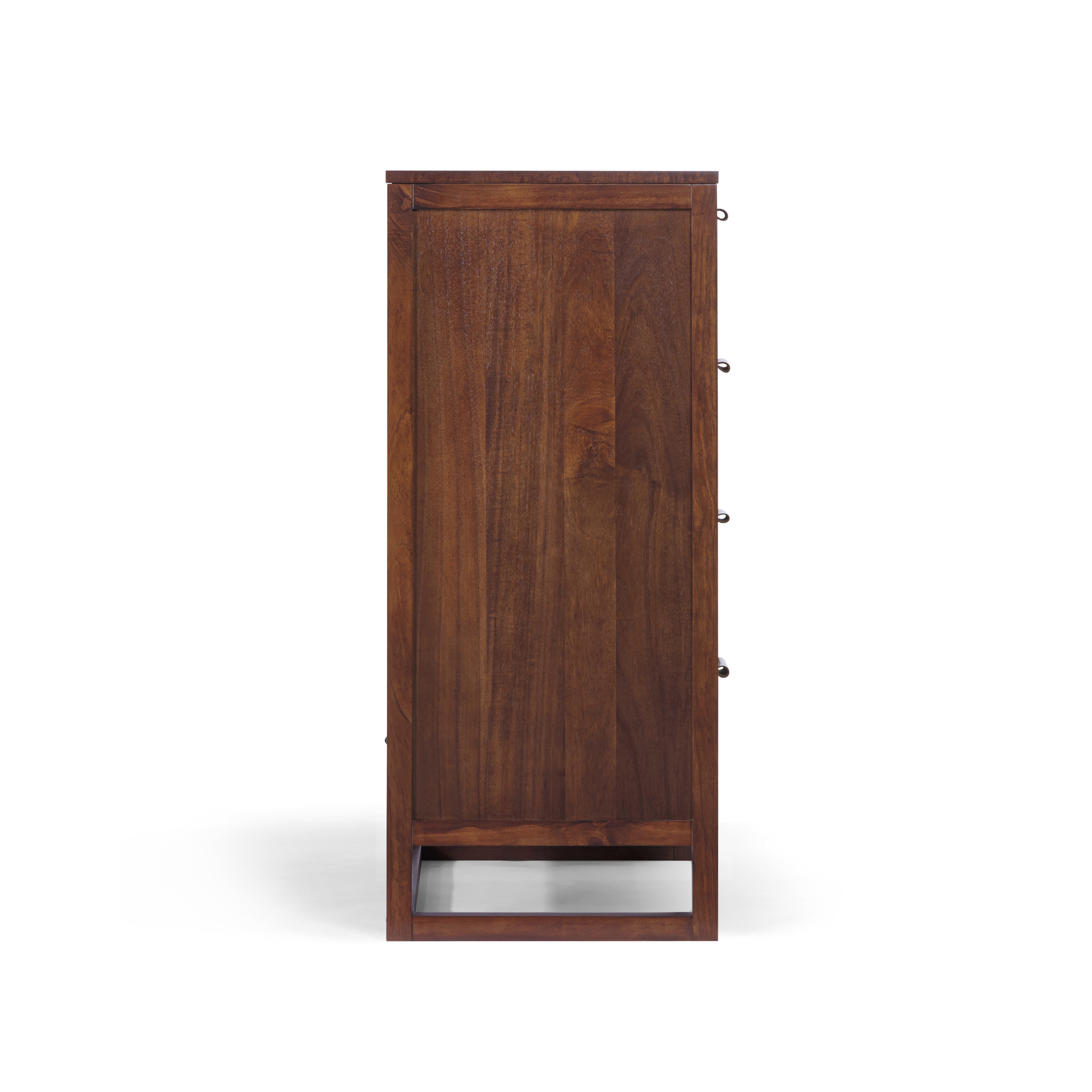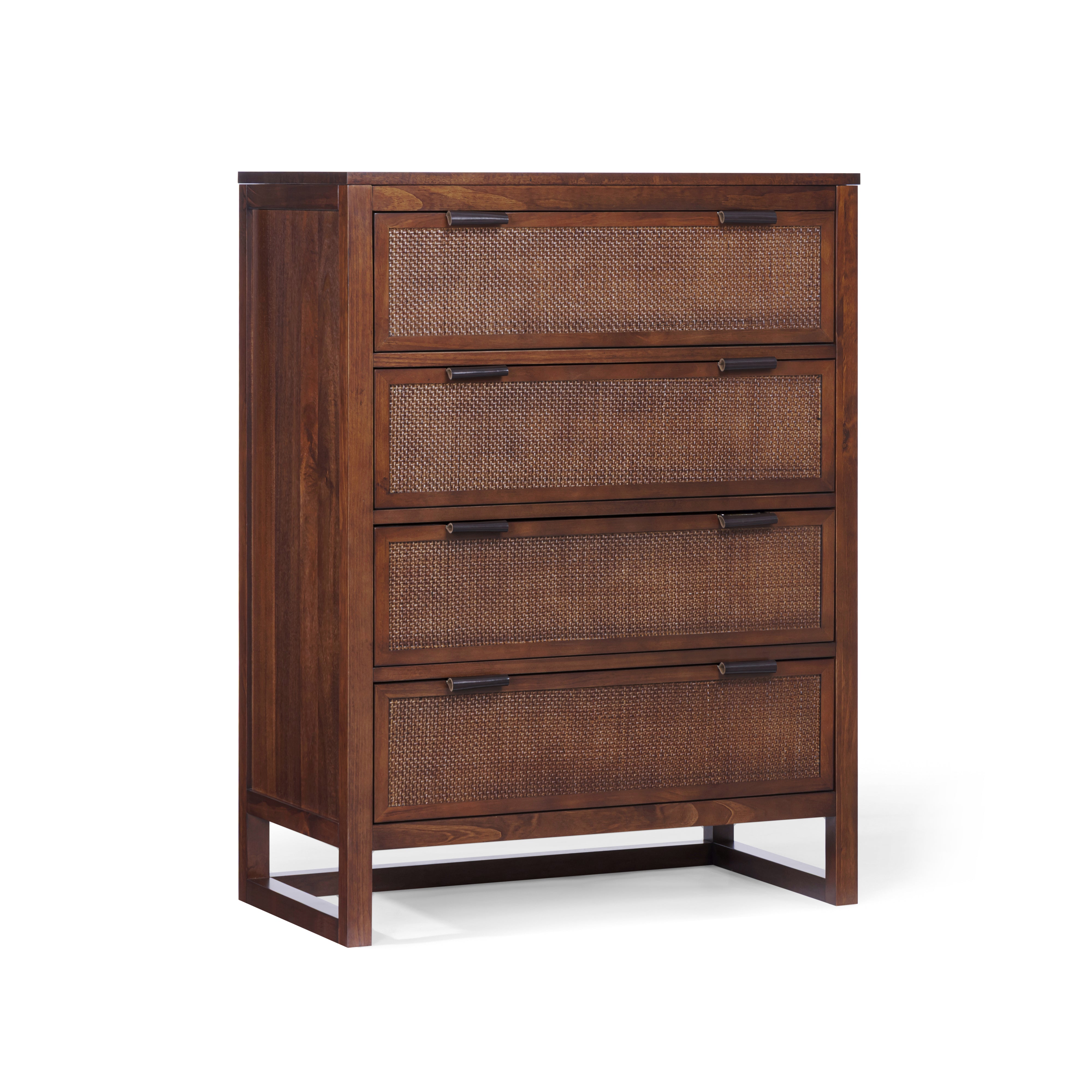 Designed to balance form and function, the Teamson Home Hatteras 76 cm wide Dresser features four deep drawers for everyday organisation. Its compact footprint suits bedrooms where space is at a premium. The dresser is constructed from a solid pine wood frame with MDF panels wrapped in acacia veneer, offering durability and stability. Rattan drawer detailing adds warmth, complemented by the walnut finish. Four drawers support organised storage, while smooth drawer movement ensures ease of use. The top surface can be styled with bedroom essentials or décor. An included anti-tip kit adds stability, and assembly is designed to be efficient. This dresser is ideal for creating organised storage with a warm, refined look.