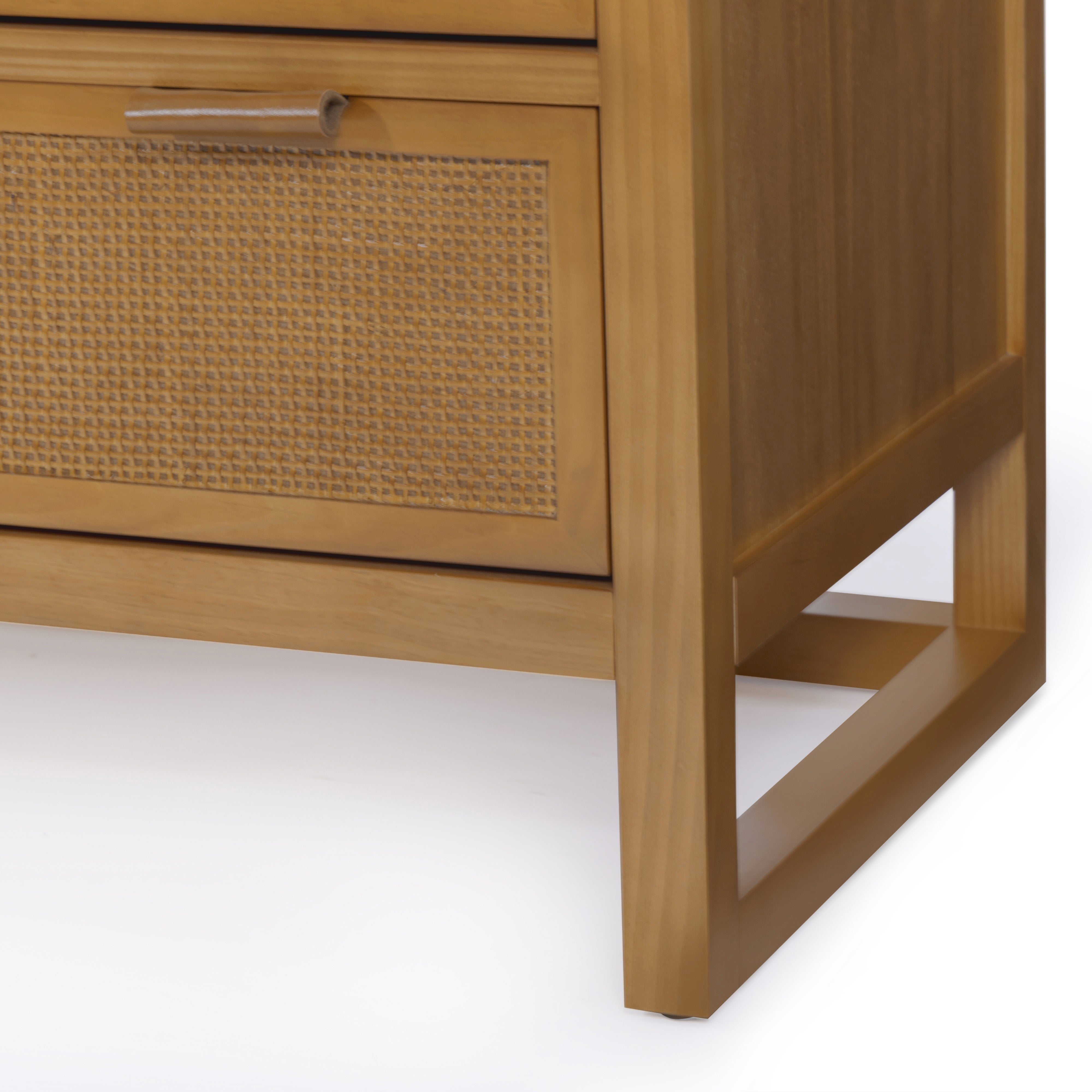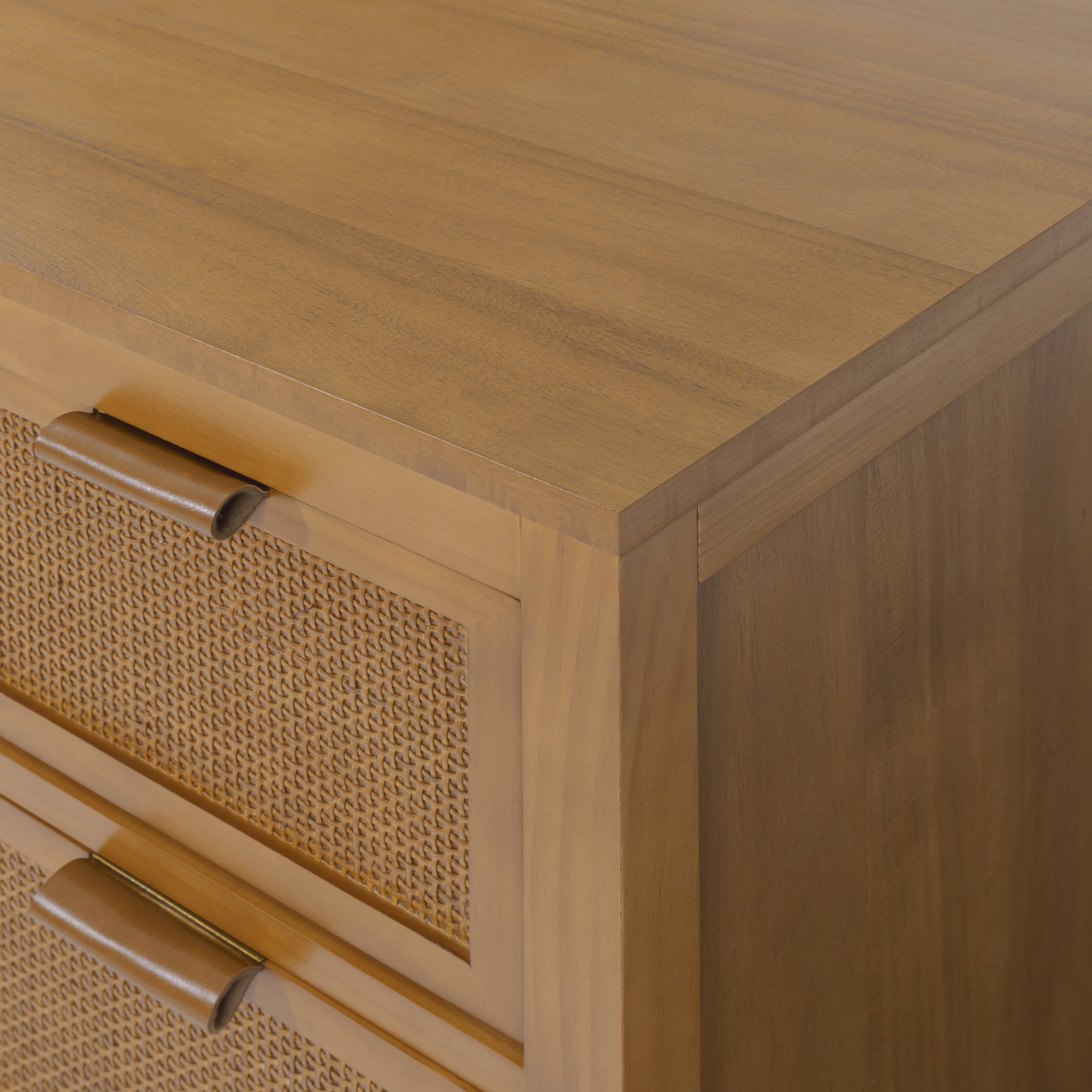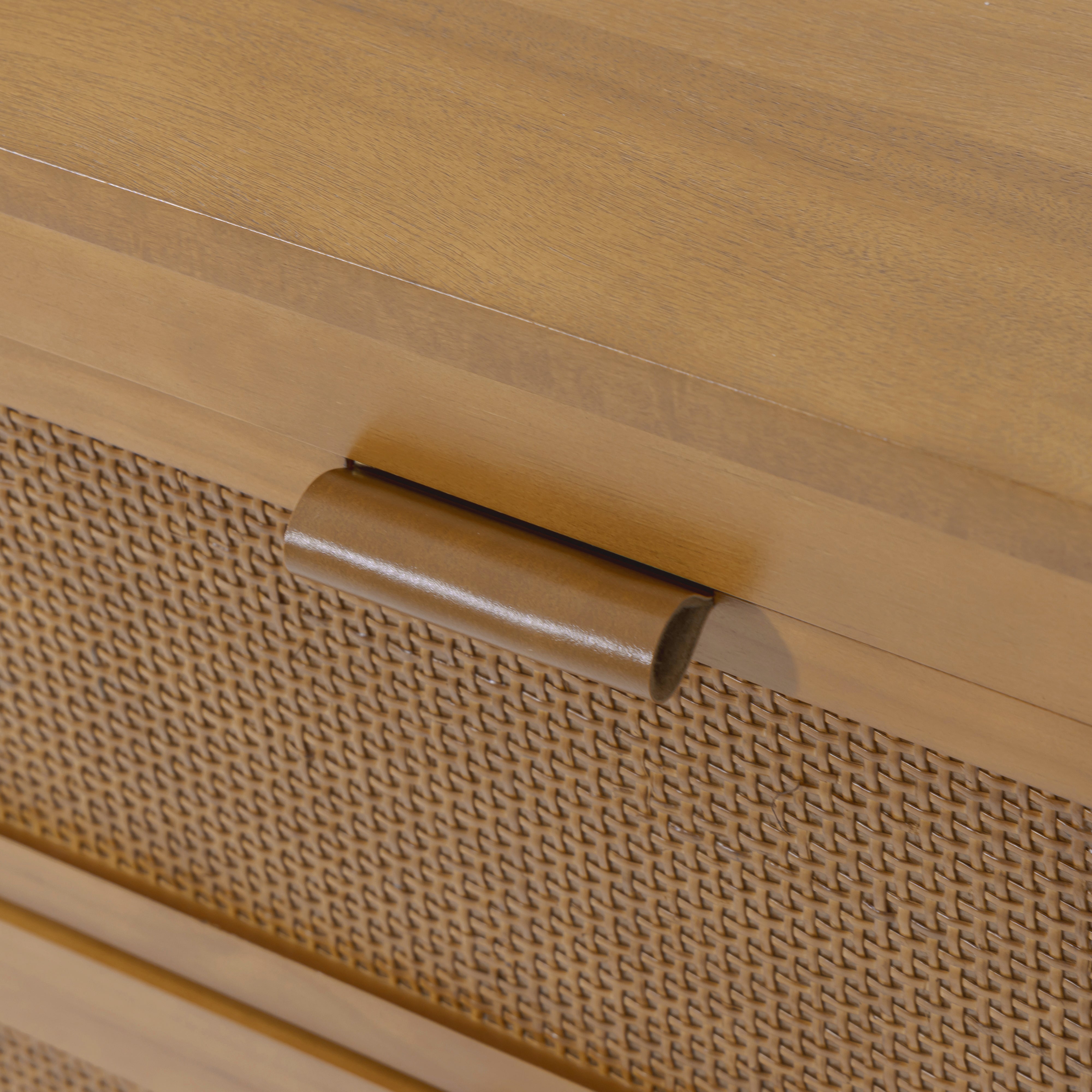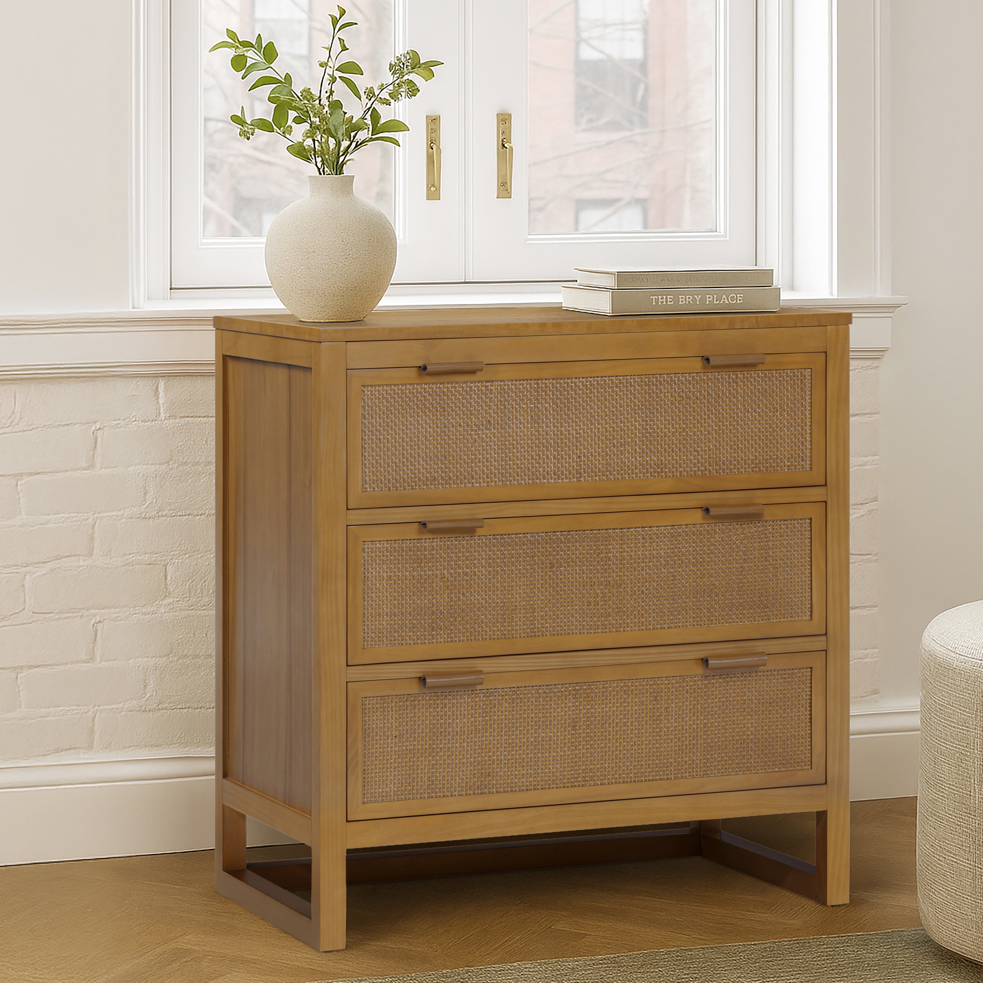 Built with a solid pine wood frame and MDF panels finished in acacia veneer, the dresser provides dependable strength for daily use. Rattan inset drawer fronts add texture and visual warmth, while the natural wood finish blends easily with modern and transitional interiors. The three spacious drawers allow items to be neatly stored and easily accessed, helping to keep bedrooms tidy without taking up unnecessary floor space.