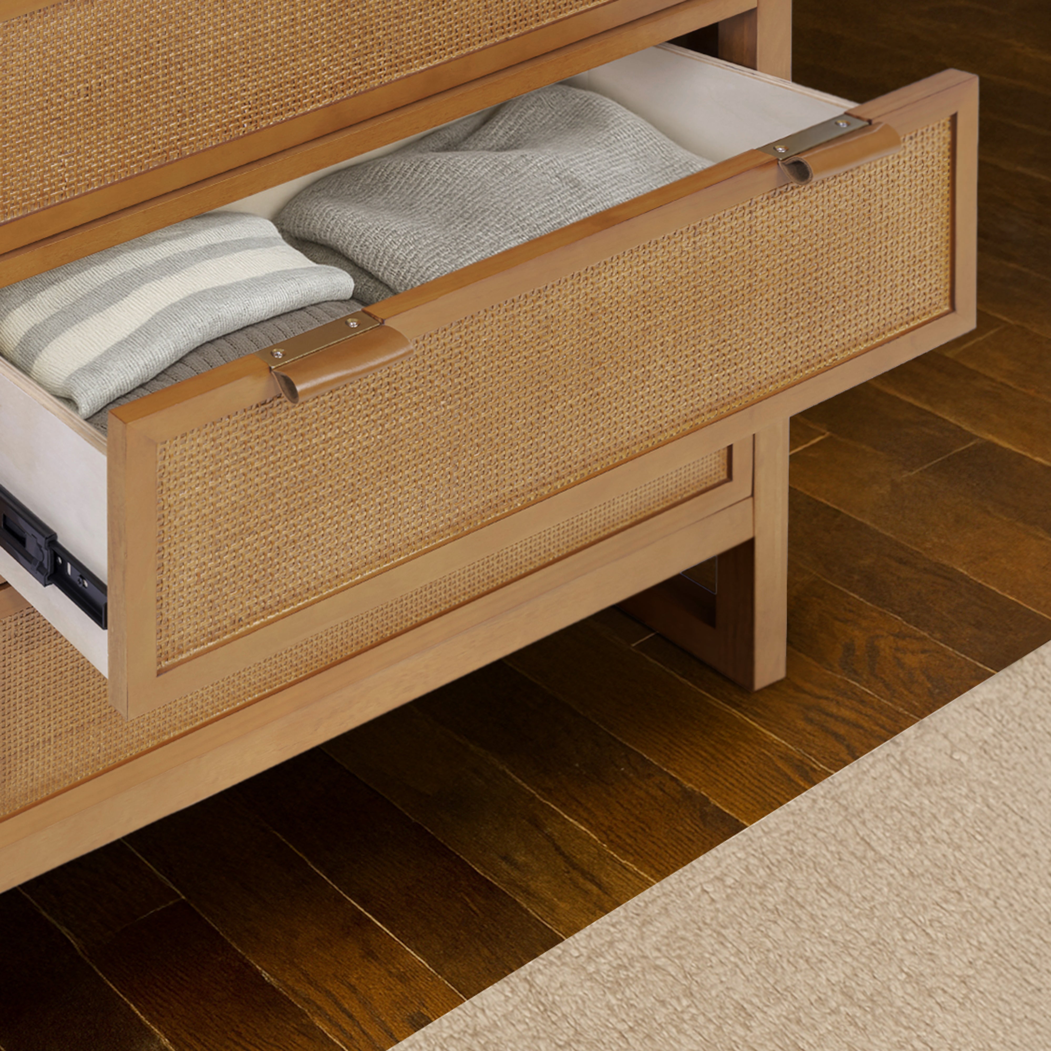 Natural Rattan Drawer Fronts: Textured detailing softens the design and adds visual interest.