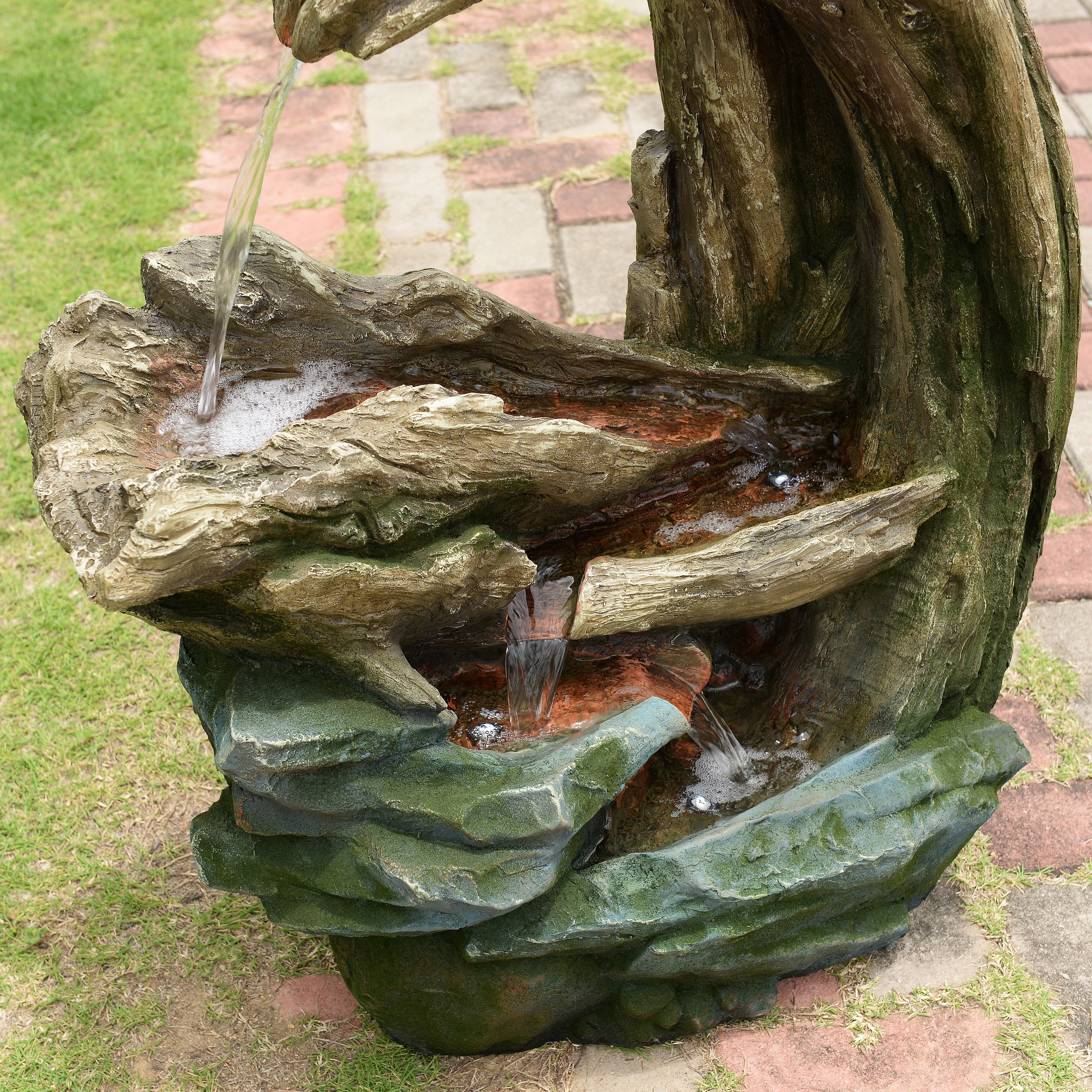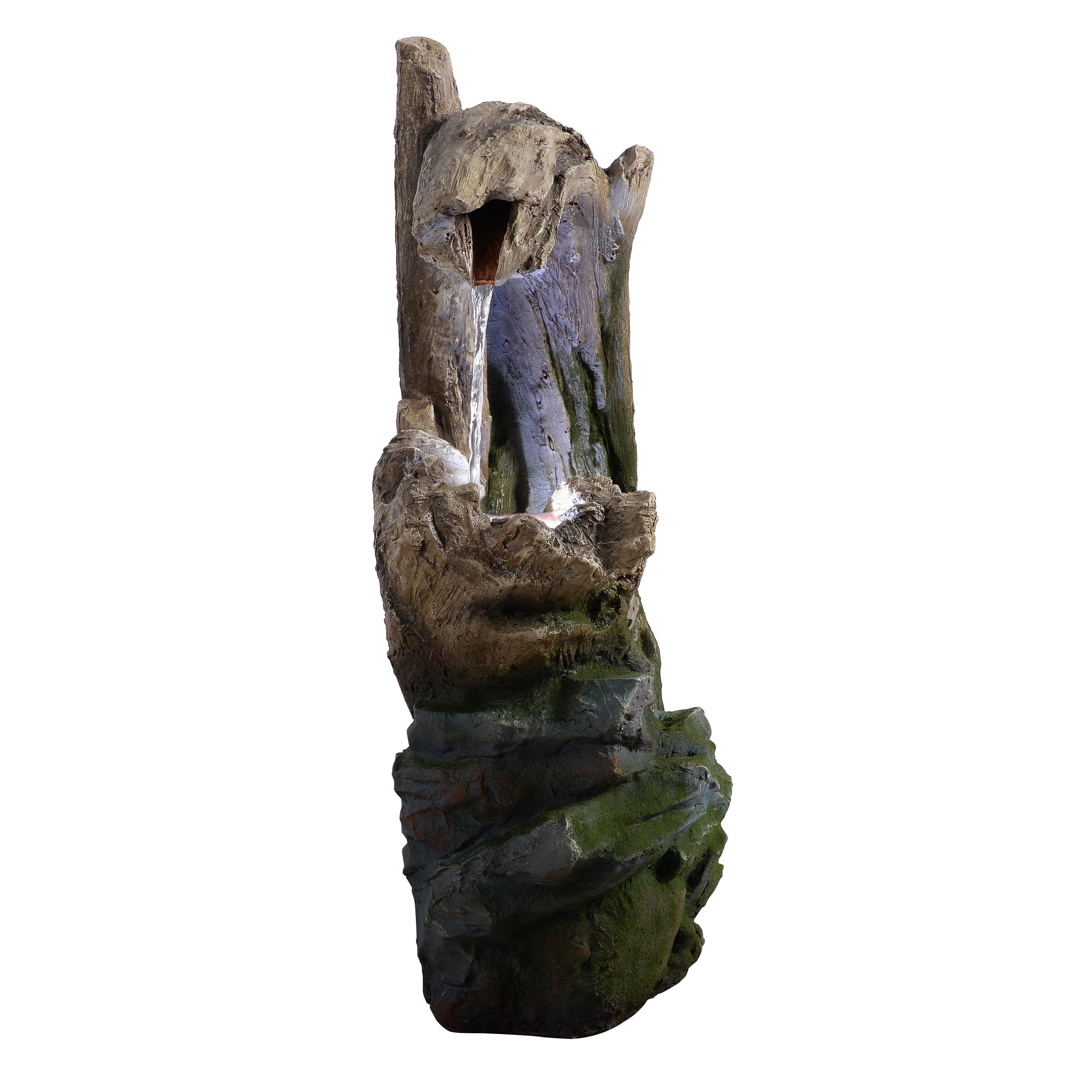 Integrated LED lights illuminate the flowing water, producing a warm glow that enhances evening ambience without overpowering the natural design. Crafted from durable polyresin, stone powder and fibreglass, the fountain captures the texture and detail of real rock and driftwood while remaining lightweight and weather-resistant. This construction ensures long-lasting outdoor performance while allowing easy positioning wherever you want to create a relaxing focal point. Installation is straightforward. Place the fountain on a stable, level surface, connect the pump and LED cables, fill the basin with clean water until the pump is fully submerged and plug into a GFCI-protected outdoor socket.