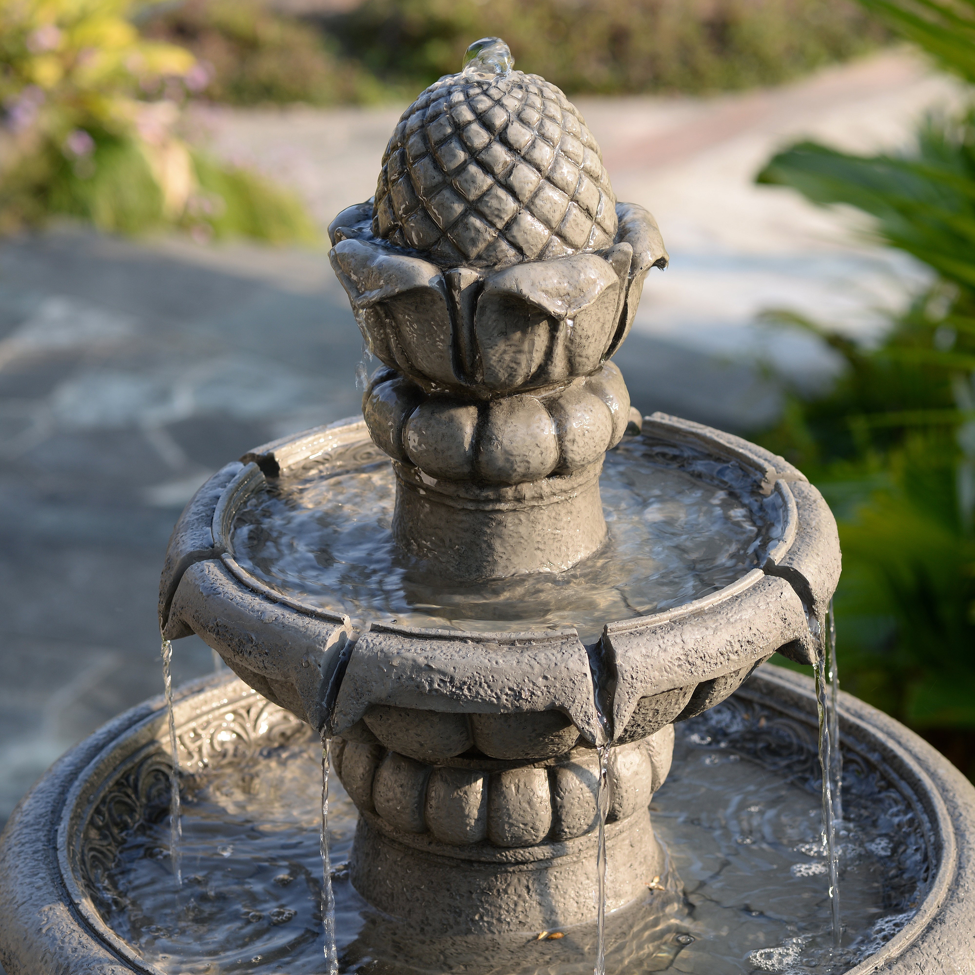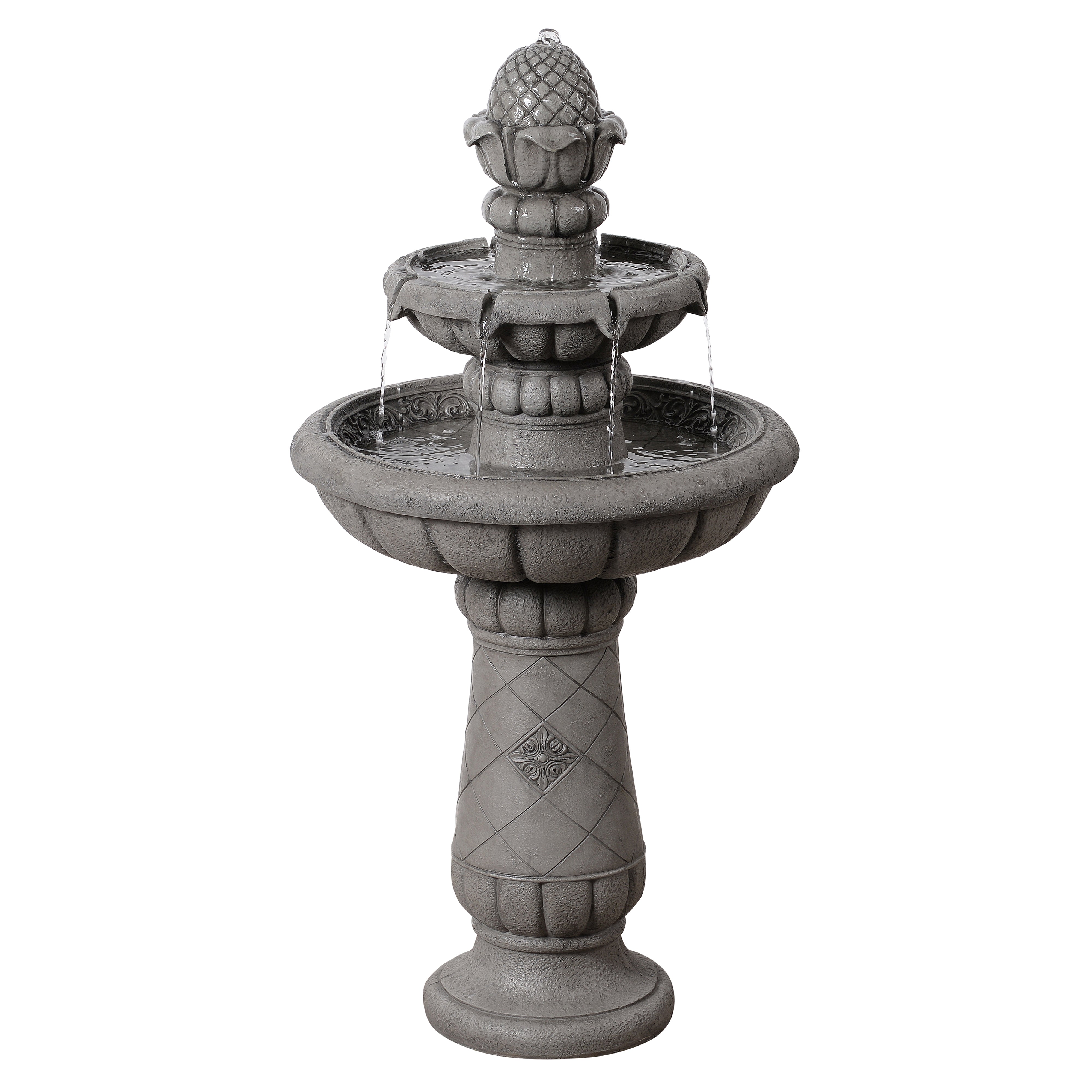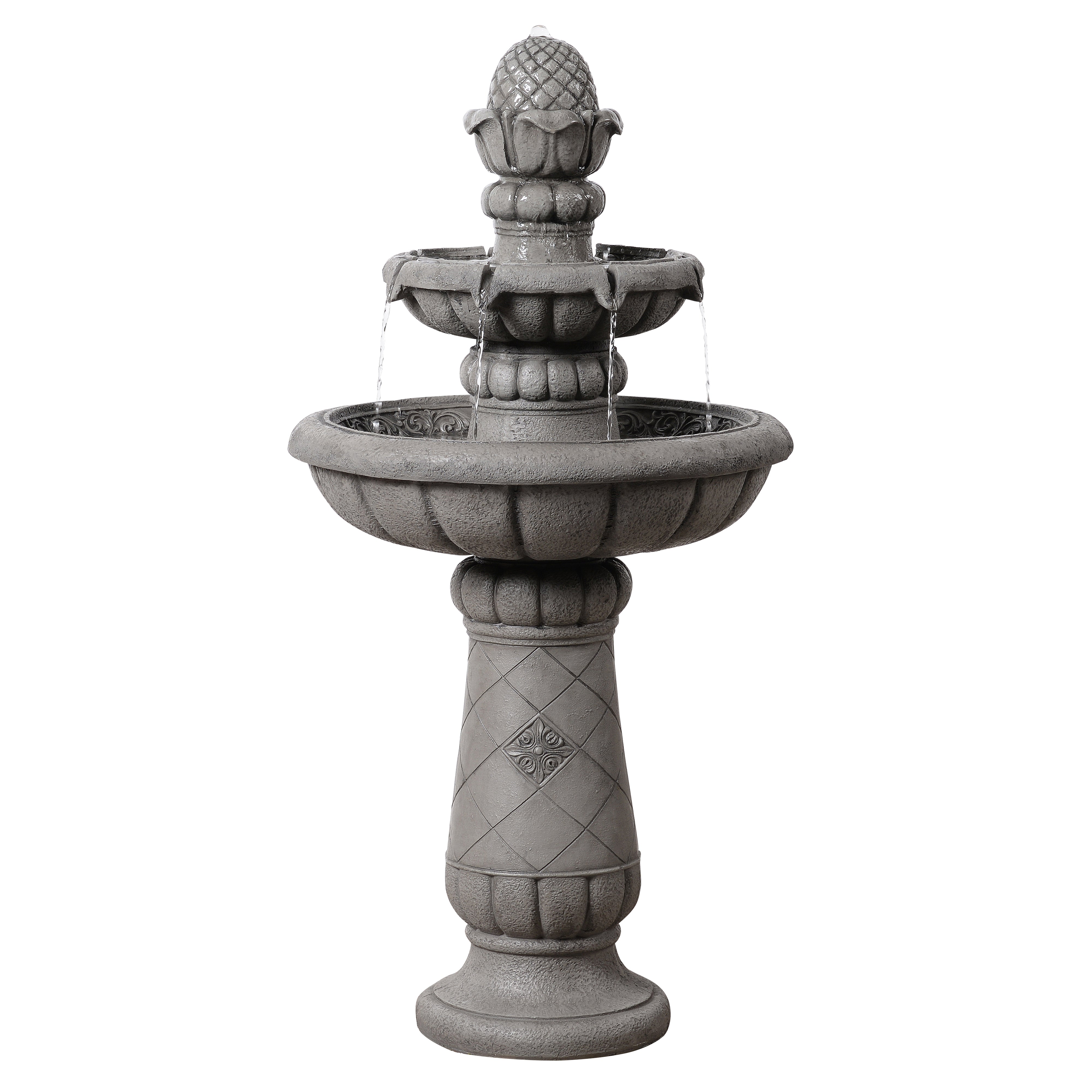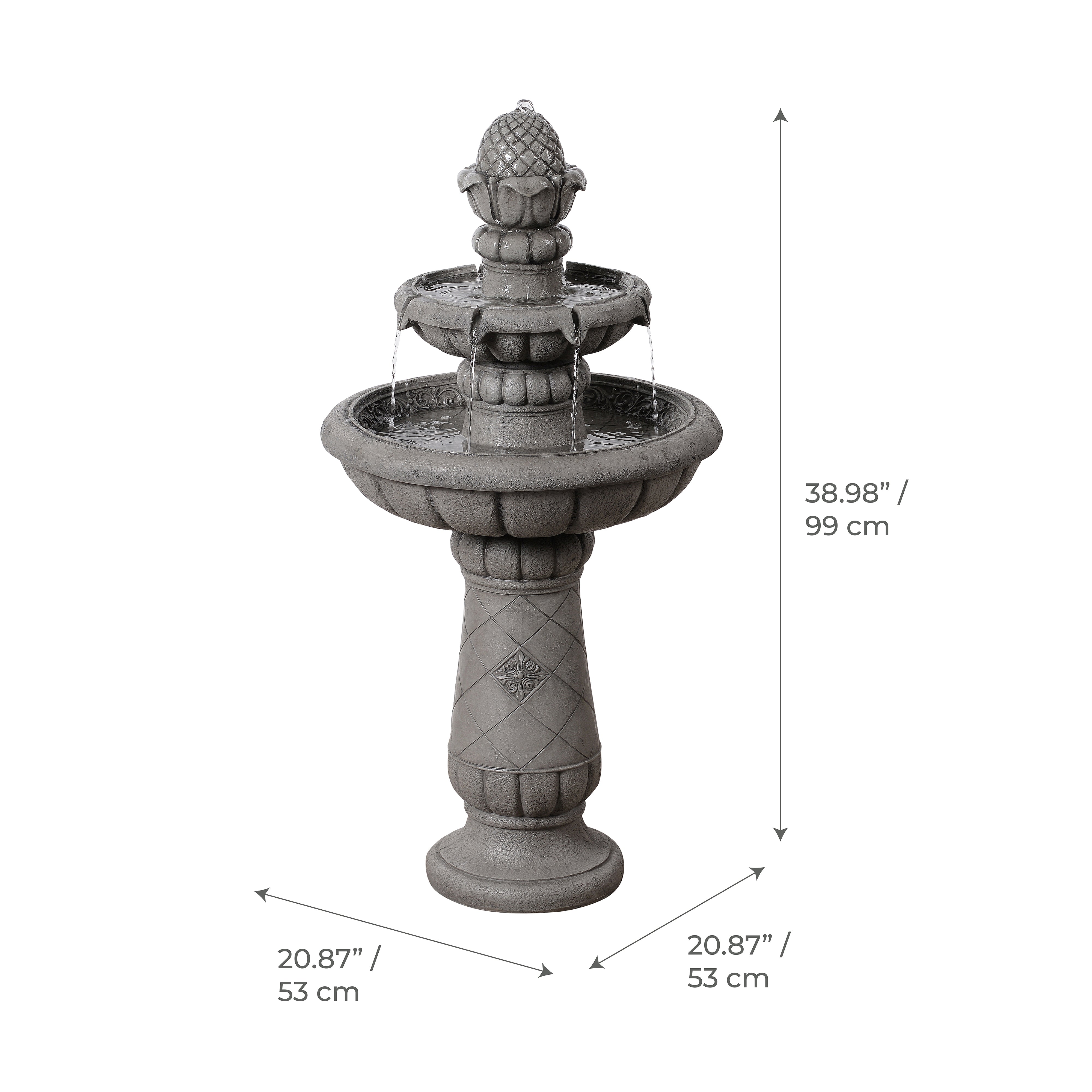 The soft grey finish pairs easily with greenery, paving and a wide range of garden styles. Installation is simple. Place the fountain on a stable, level surface, fill with clean water, connect the pump and plug into a GFCI-protected outdoor socket. The recirculating pump ensures continuous flow without excessive water use.