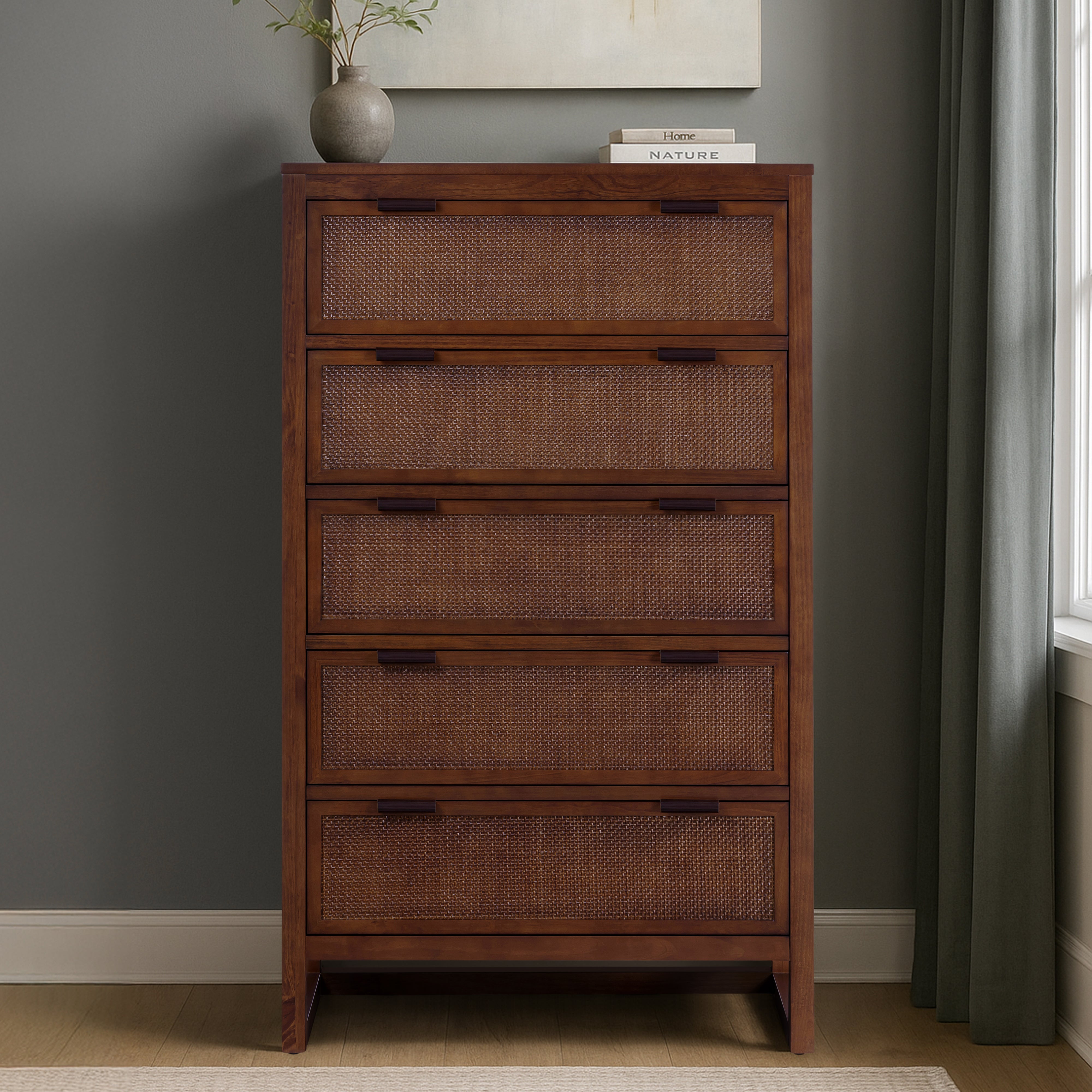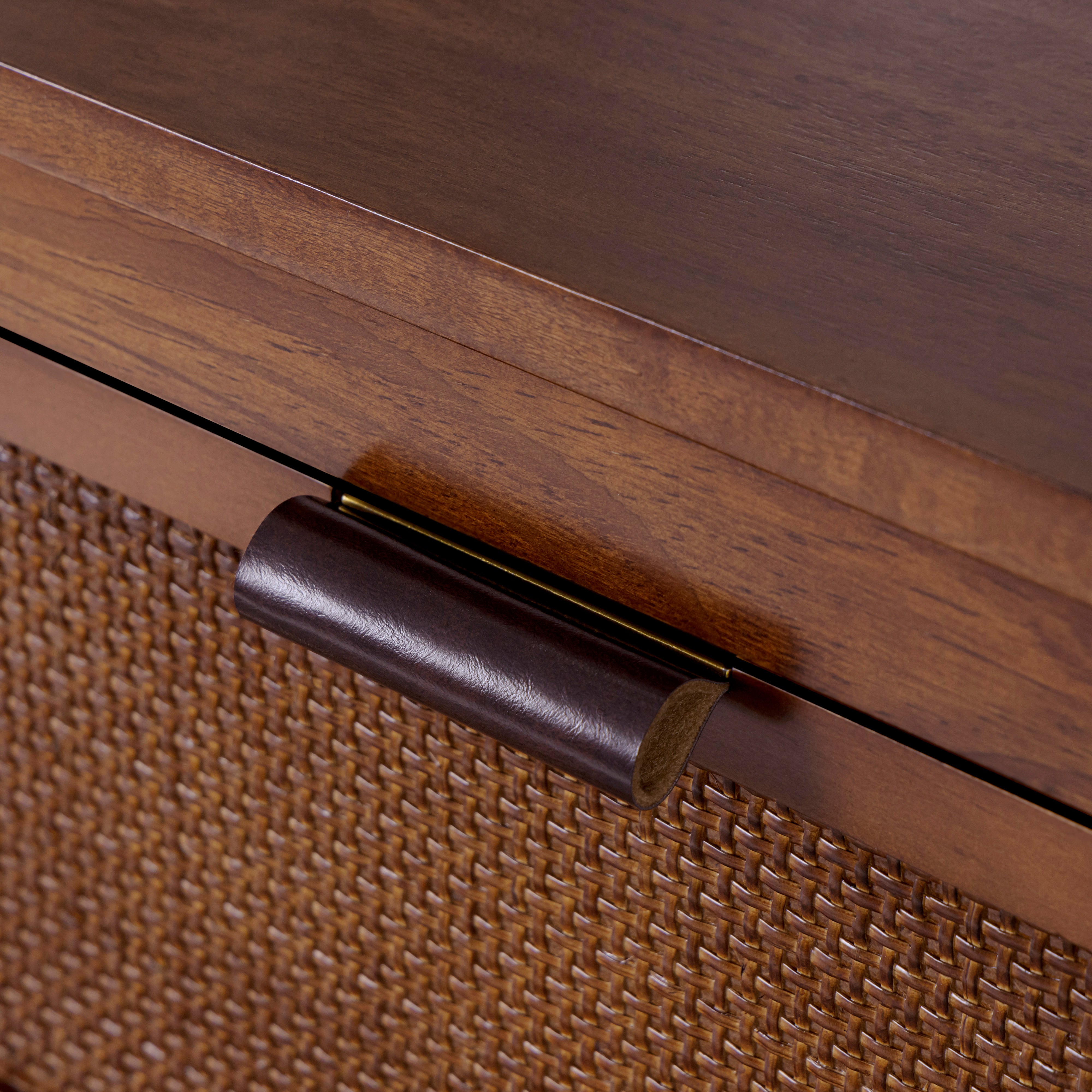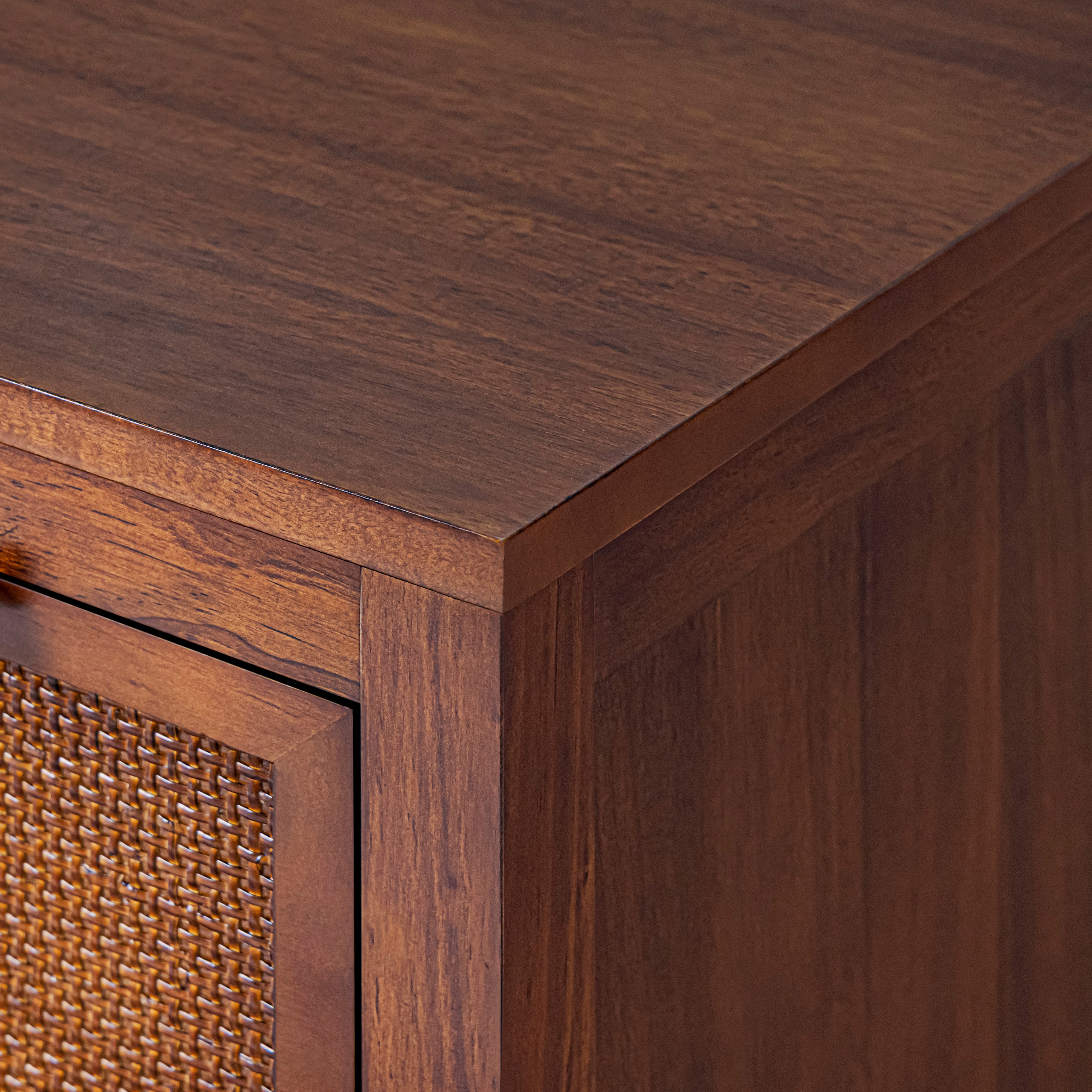 Rattan Drawer Detailing: Natural rattan insets add texture and visual softness, balancing the clean-lined dresser silhouette.