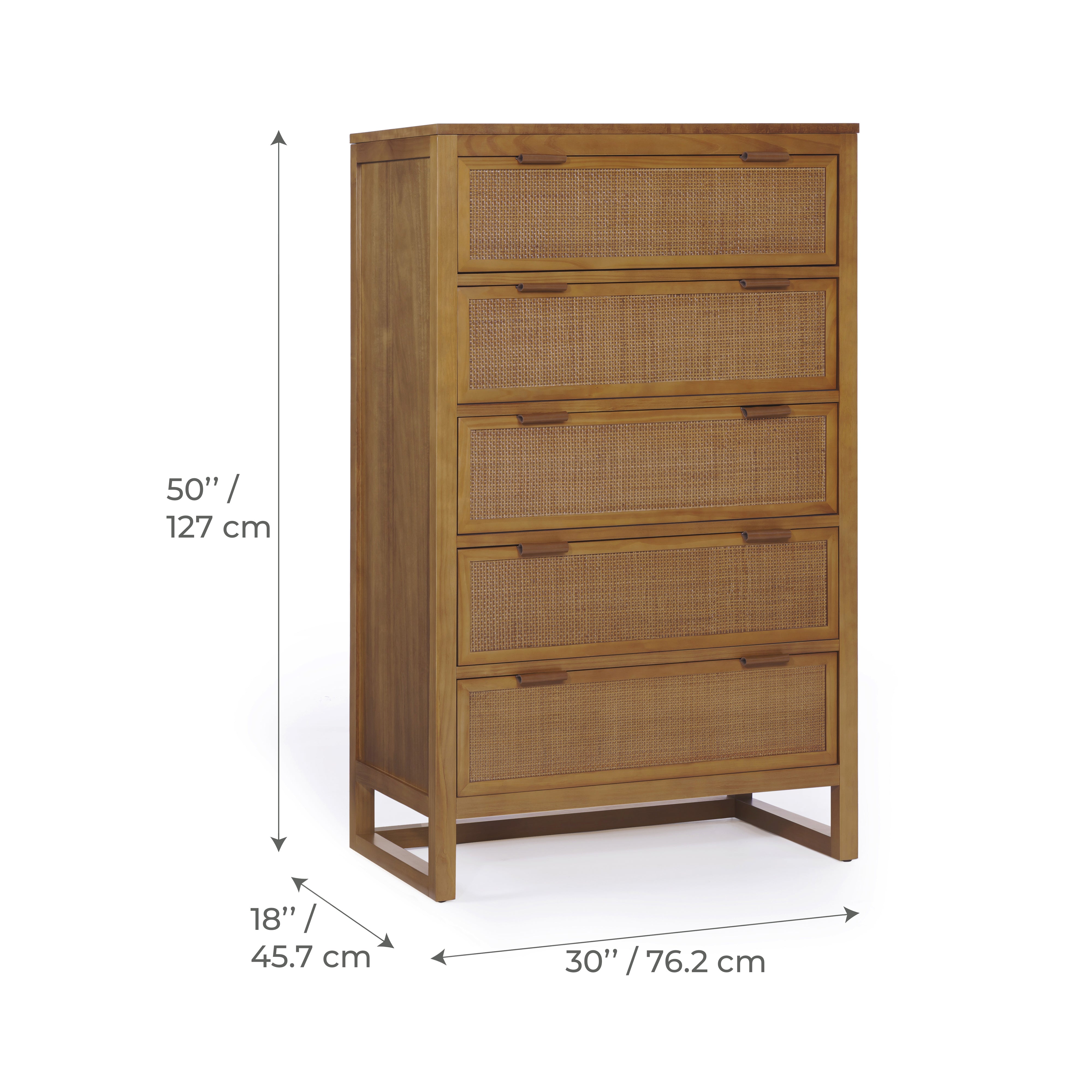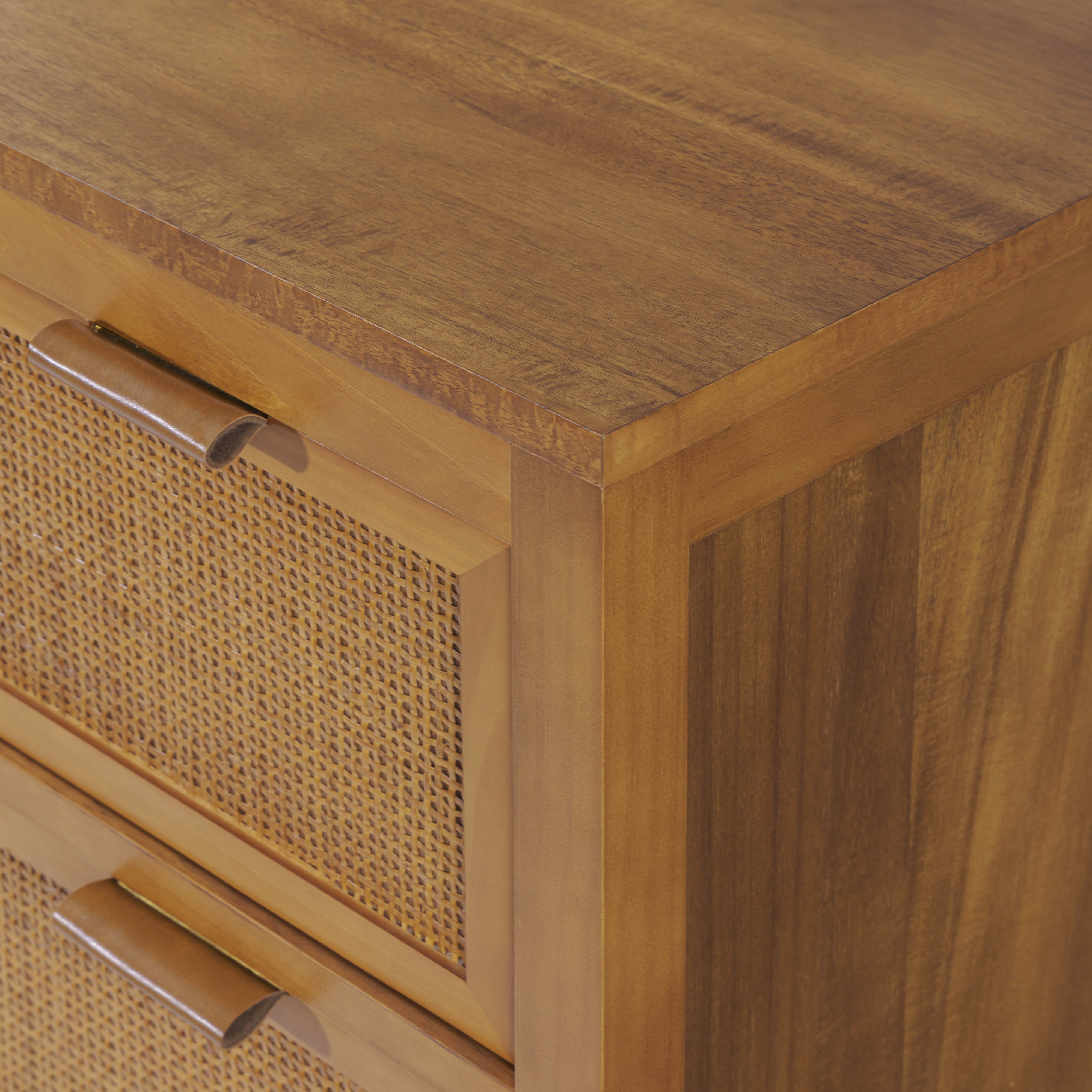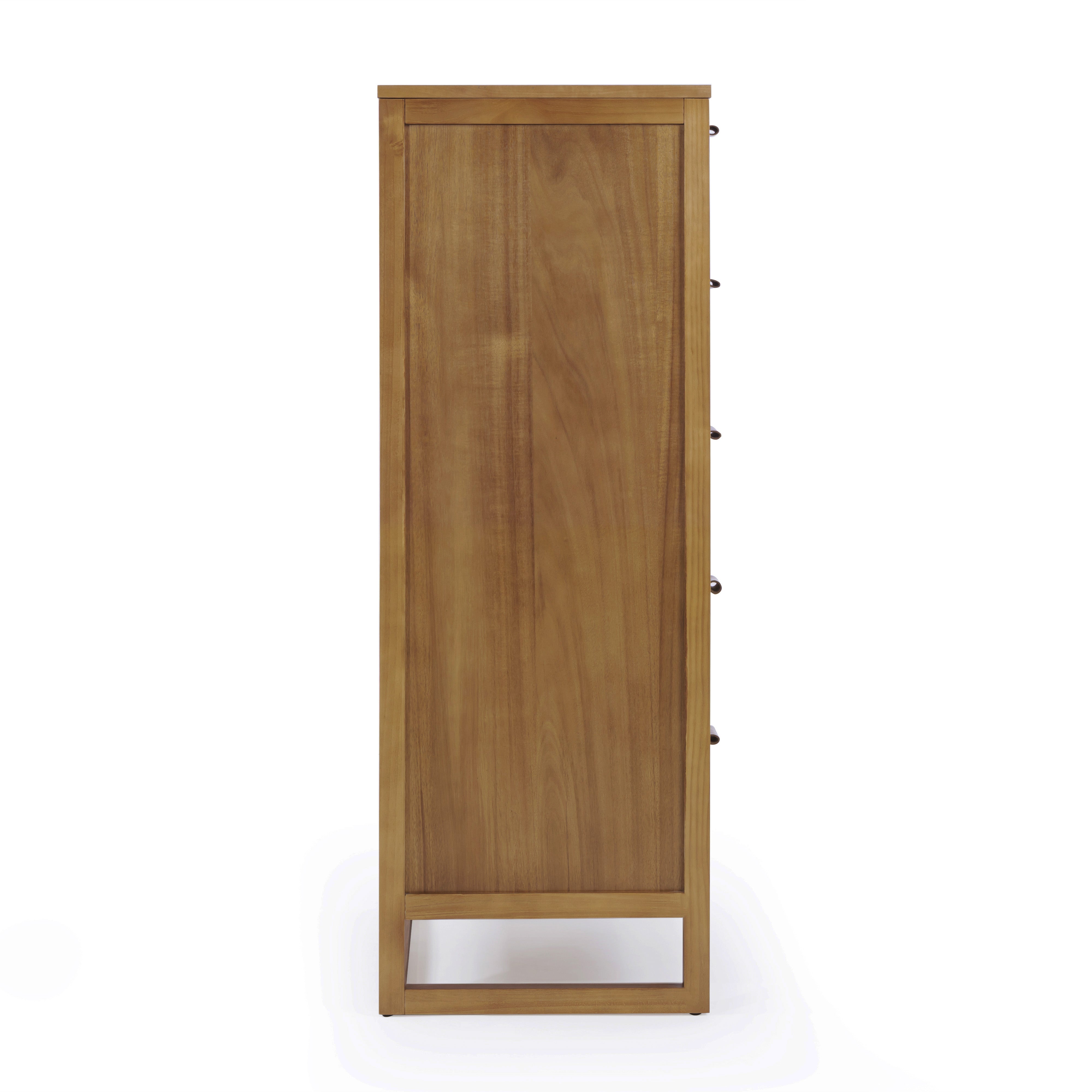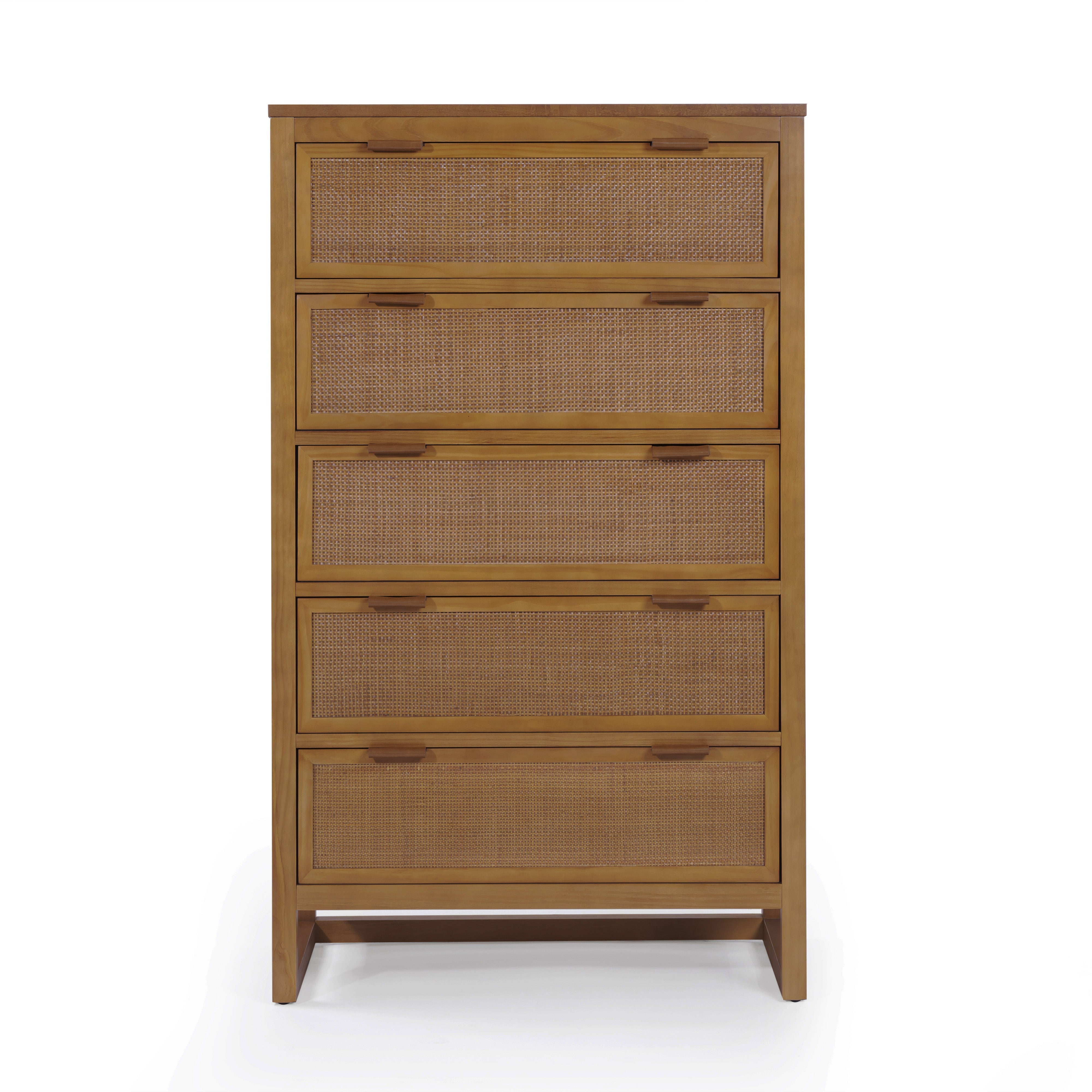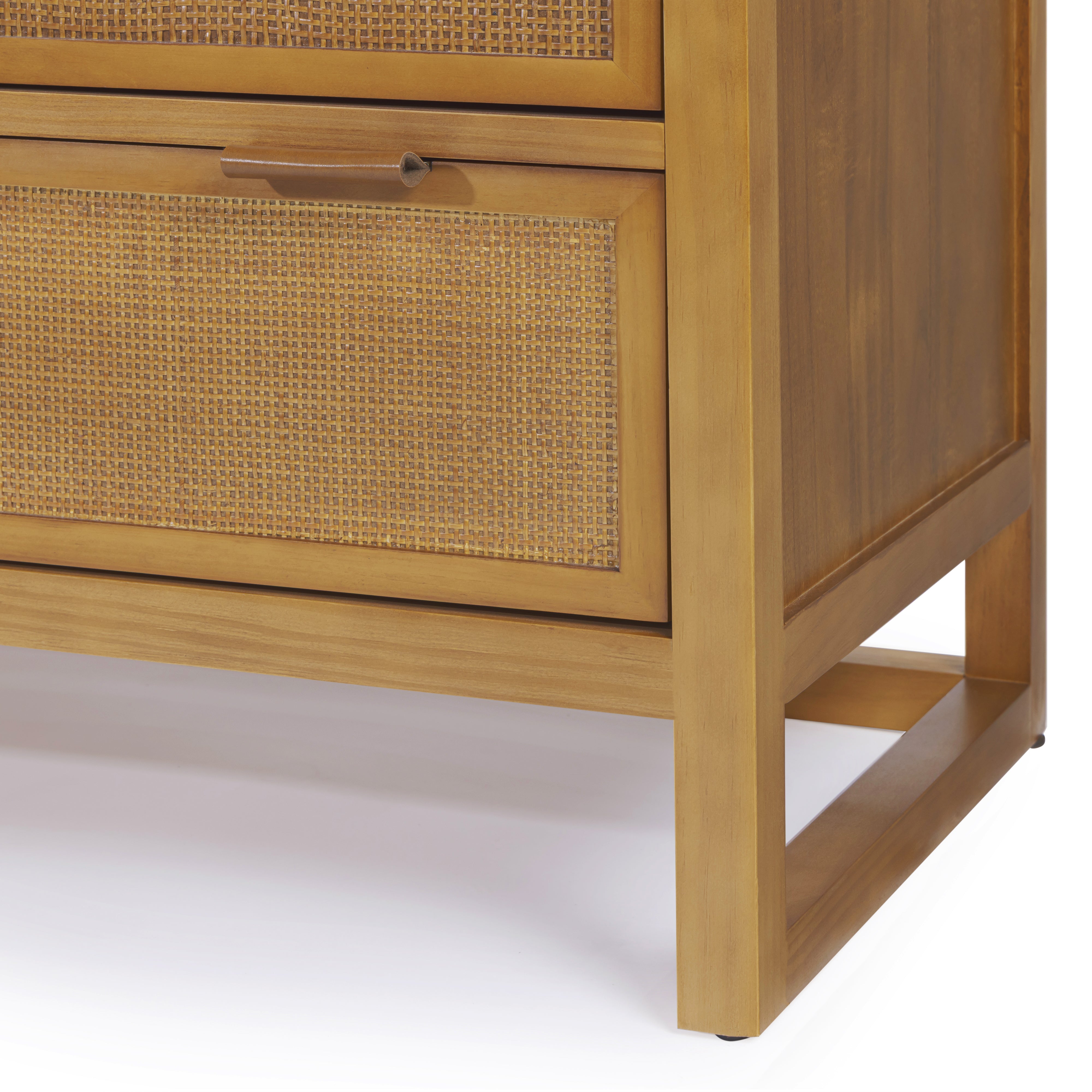 Designed for efficient organisation, the Teamson Home Hatteras 76 cm wide Dresser offers five deep drawers in a compact footprint. It delivers everyday storage for clothing and linens while maintaining a calm, uncluttered appearance. Constructed with a solid pine wood frame and MDF panels finished in acacia veneer, the dresser provides dependable strength. Rattan inset drawer fronts introduce texture, and the natural finish blends easily with a wide range of interior styles.