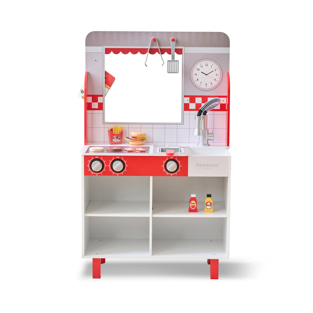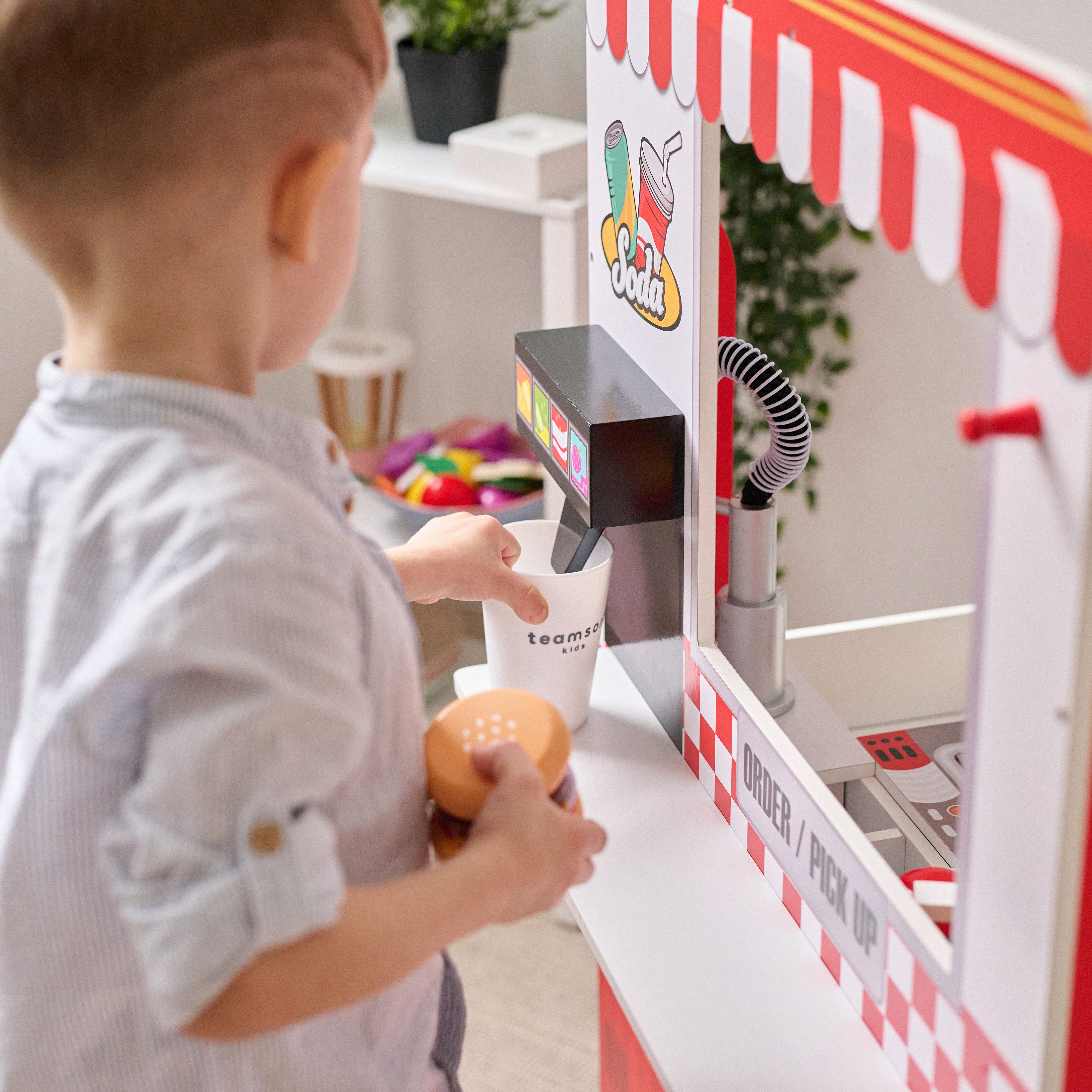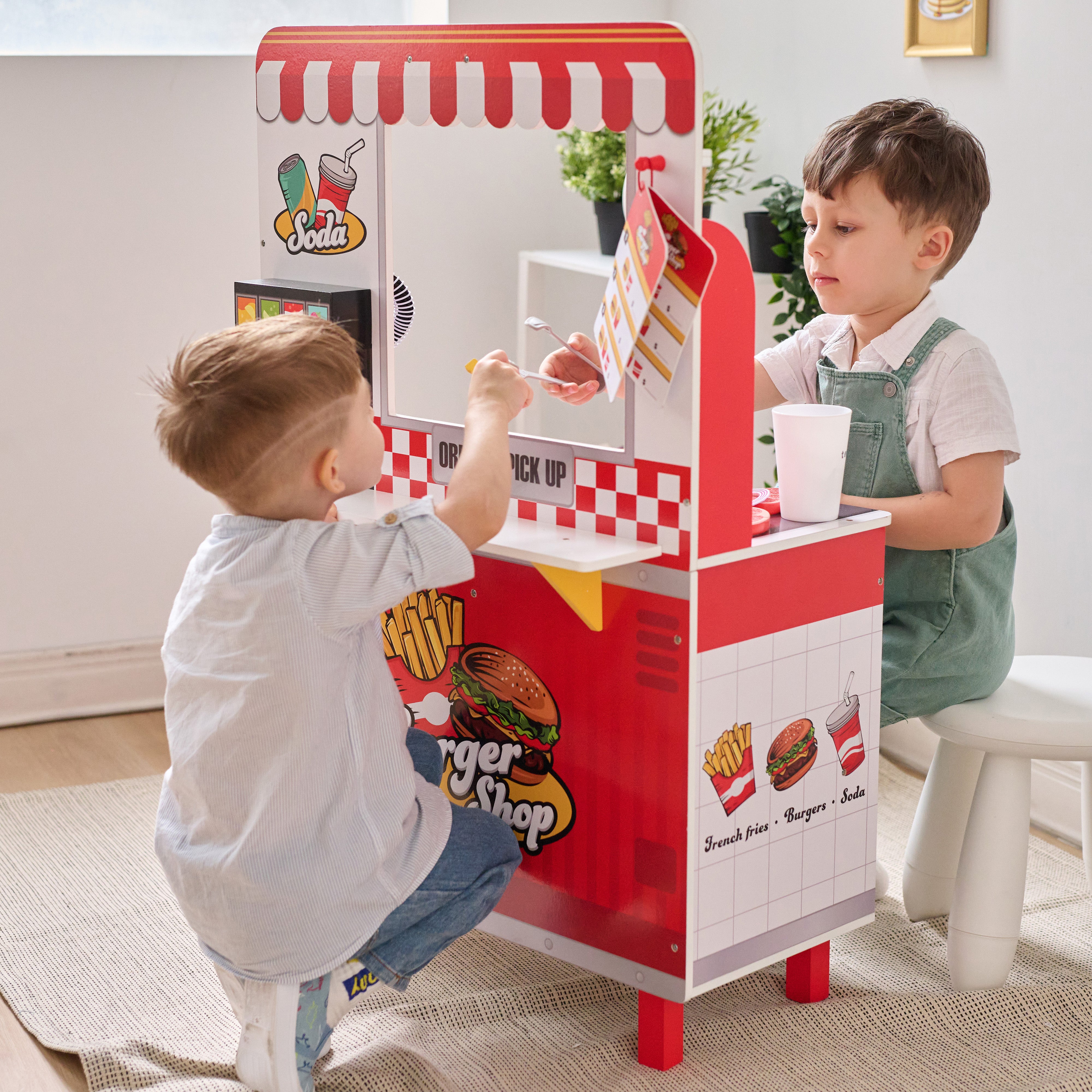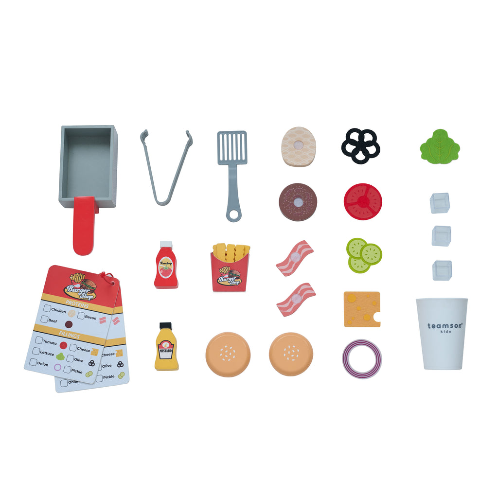 Wooden Play Burger Shop with 29 Accessories, Red - Flip & Fry Teamson Kids