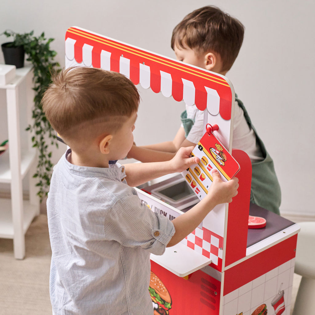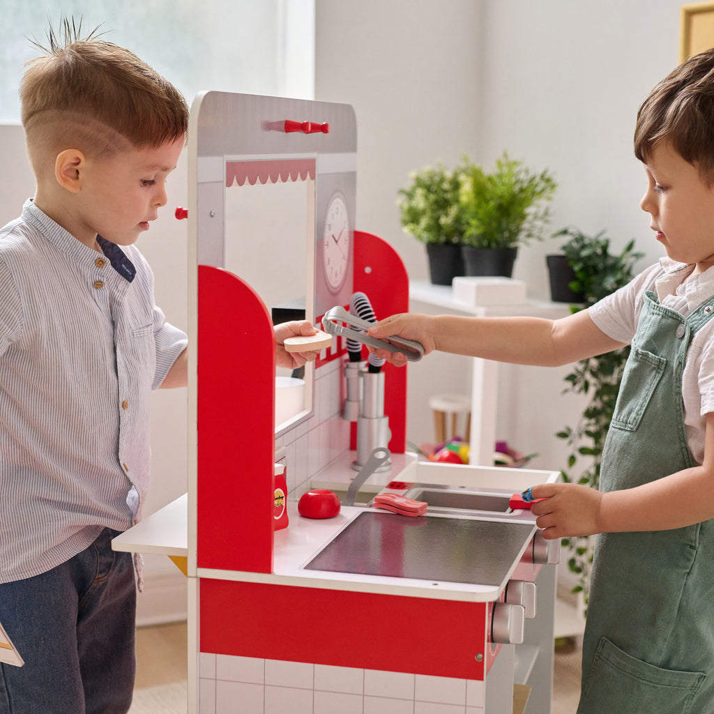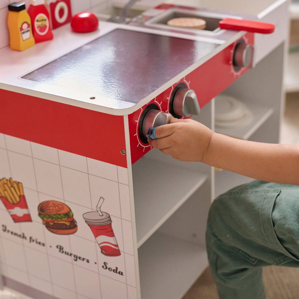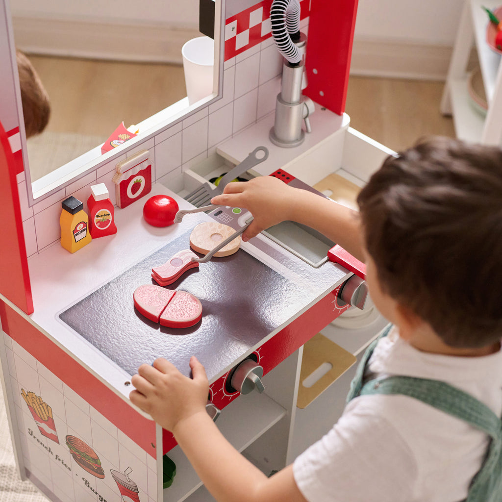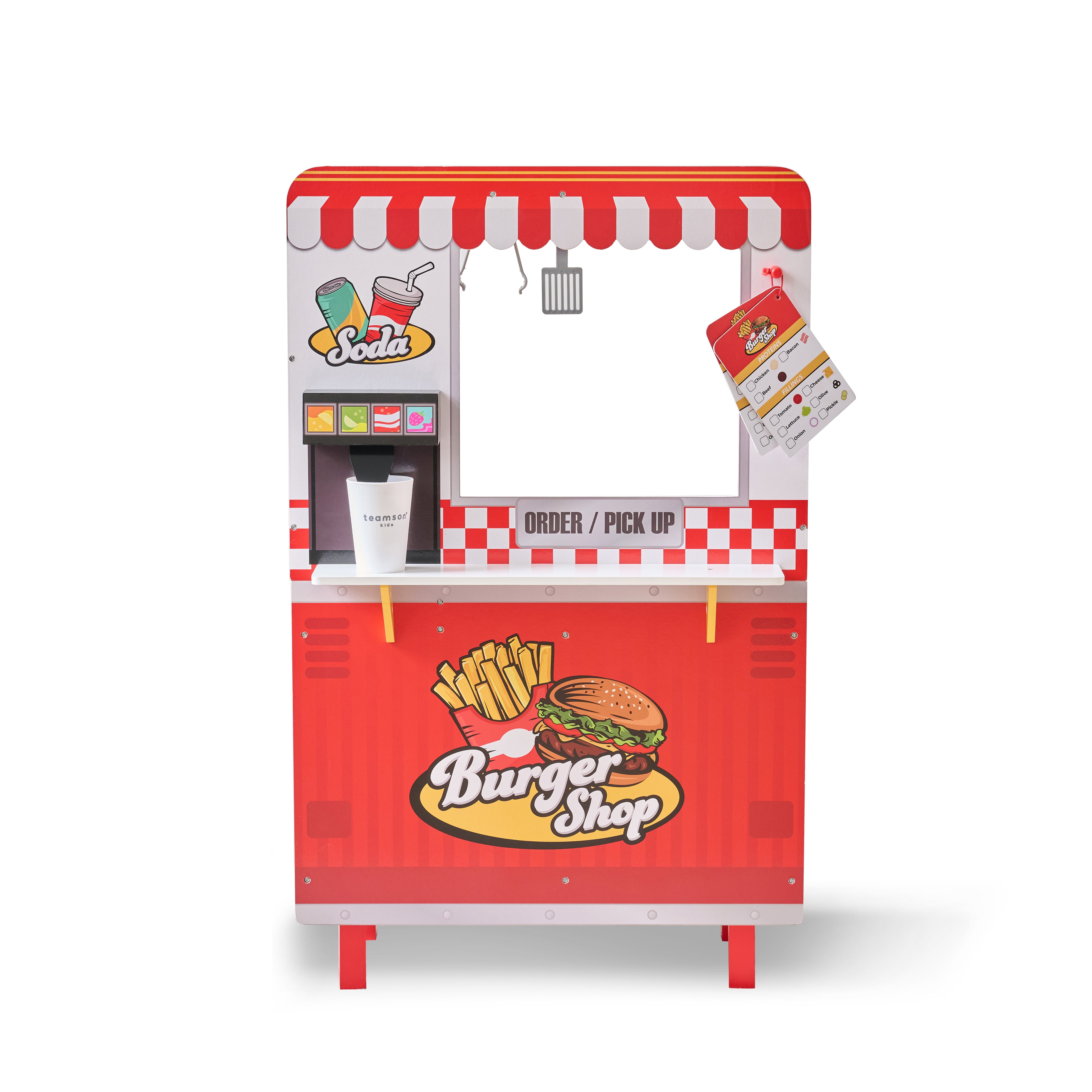 Wooden Play Burger Shop with 29 Accessories, Red - Flip & Fry Teamson Kids