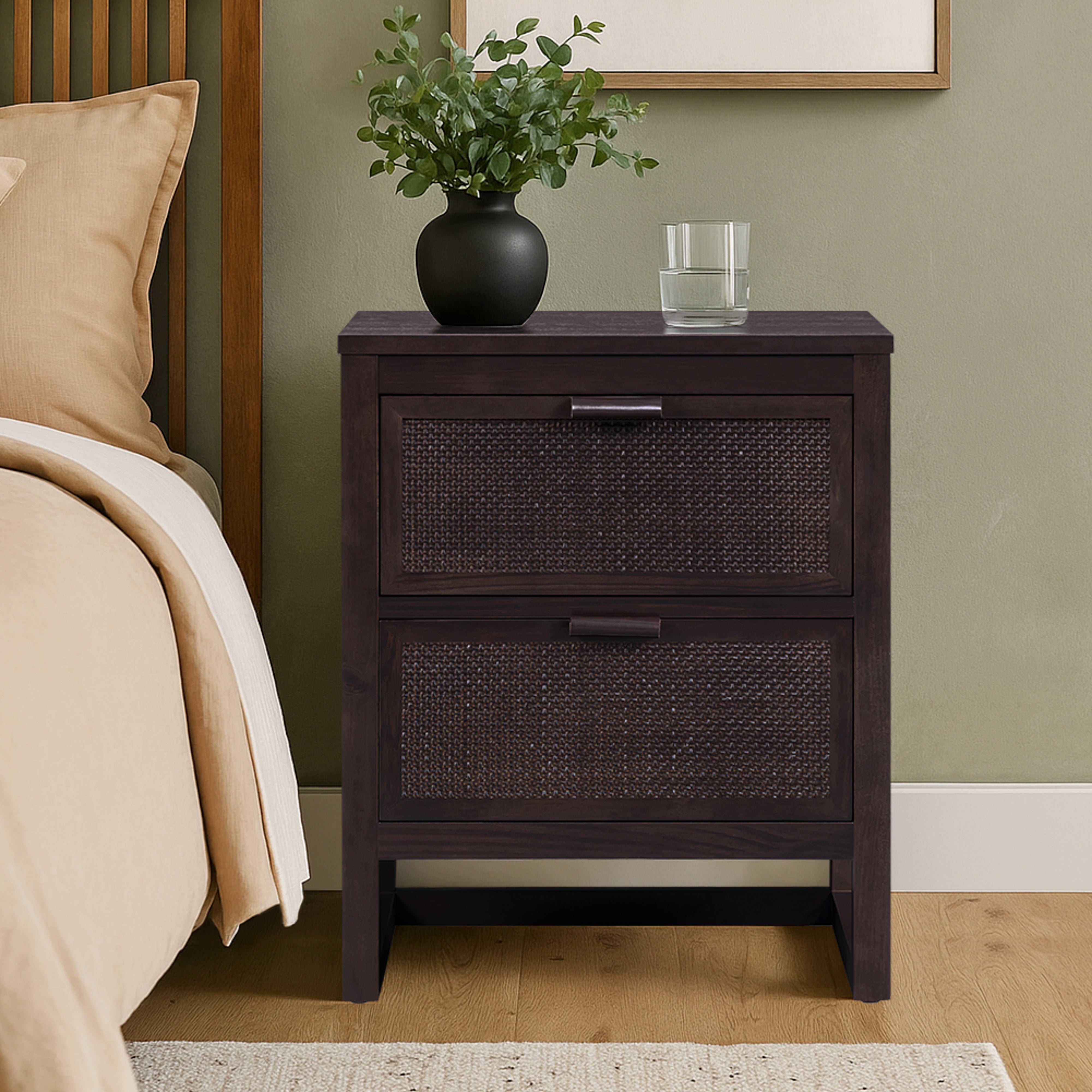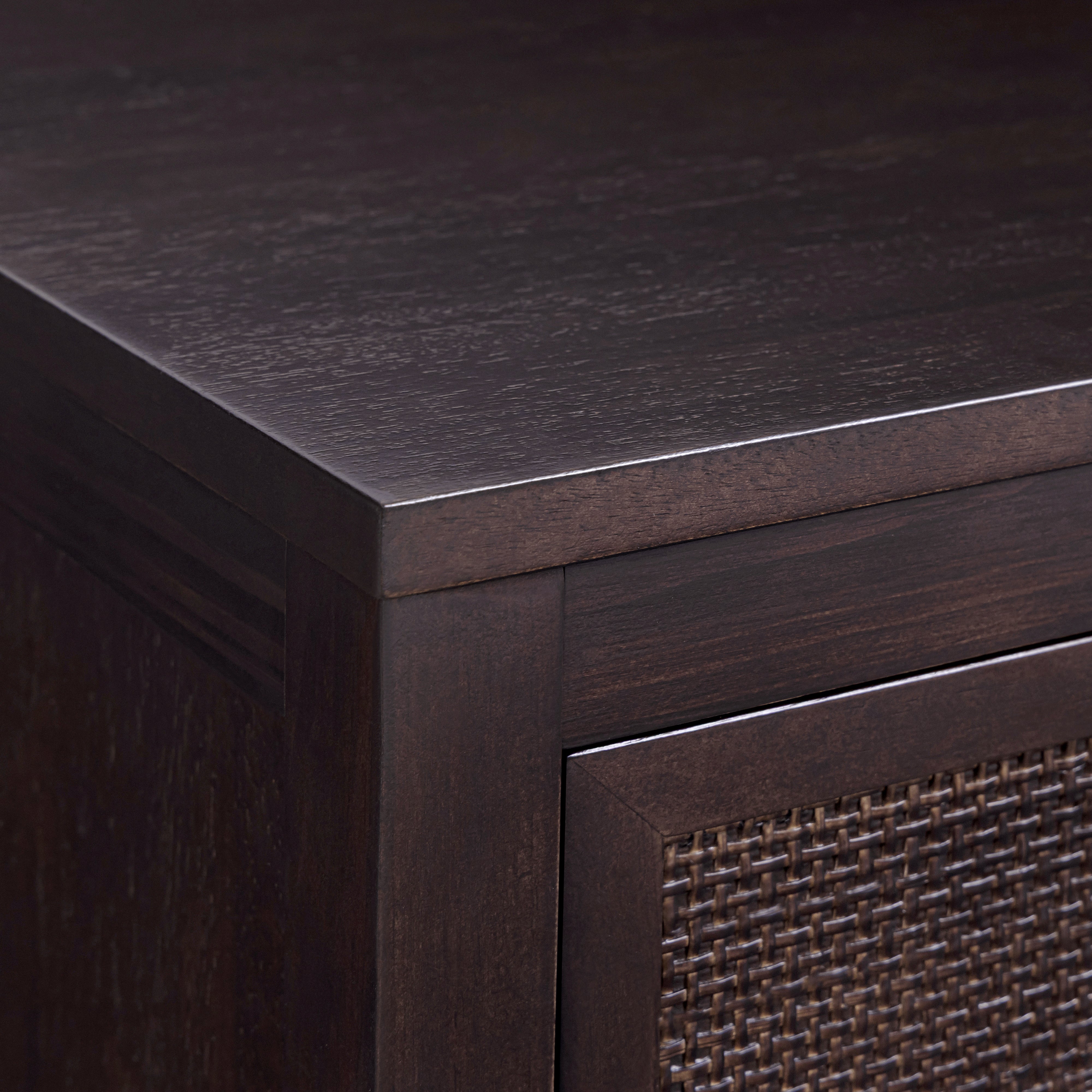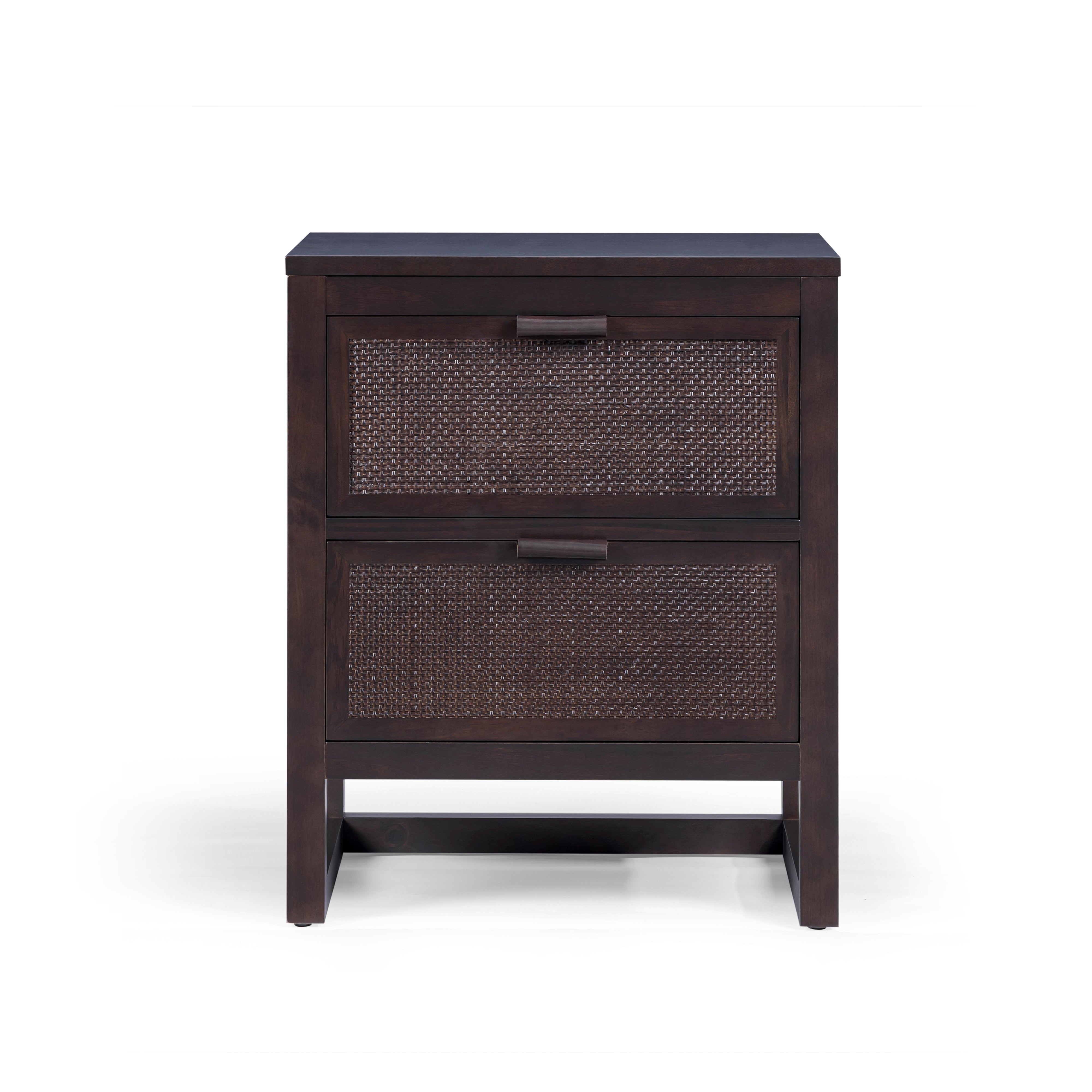 The Teamson Home Hatteras 51 cm wide Nightstand brings practical bedside storage with a balanced, modern design. Featuring two deep drawers, it offers space for books, devices and everyday essentials while keeping surfaces clear. Built from a solid pine wood frame with MDF panels finished in acacia veneer, the nightstand delivers strength and stability for daily use. Rattan inset drawer fronts add texture and visual interest, complemented by the rich mocha brown finish.
